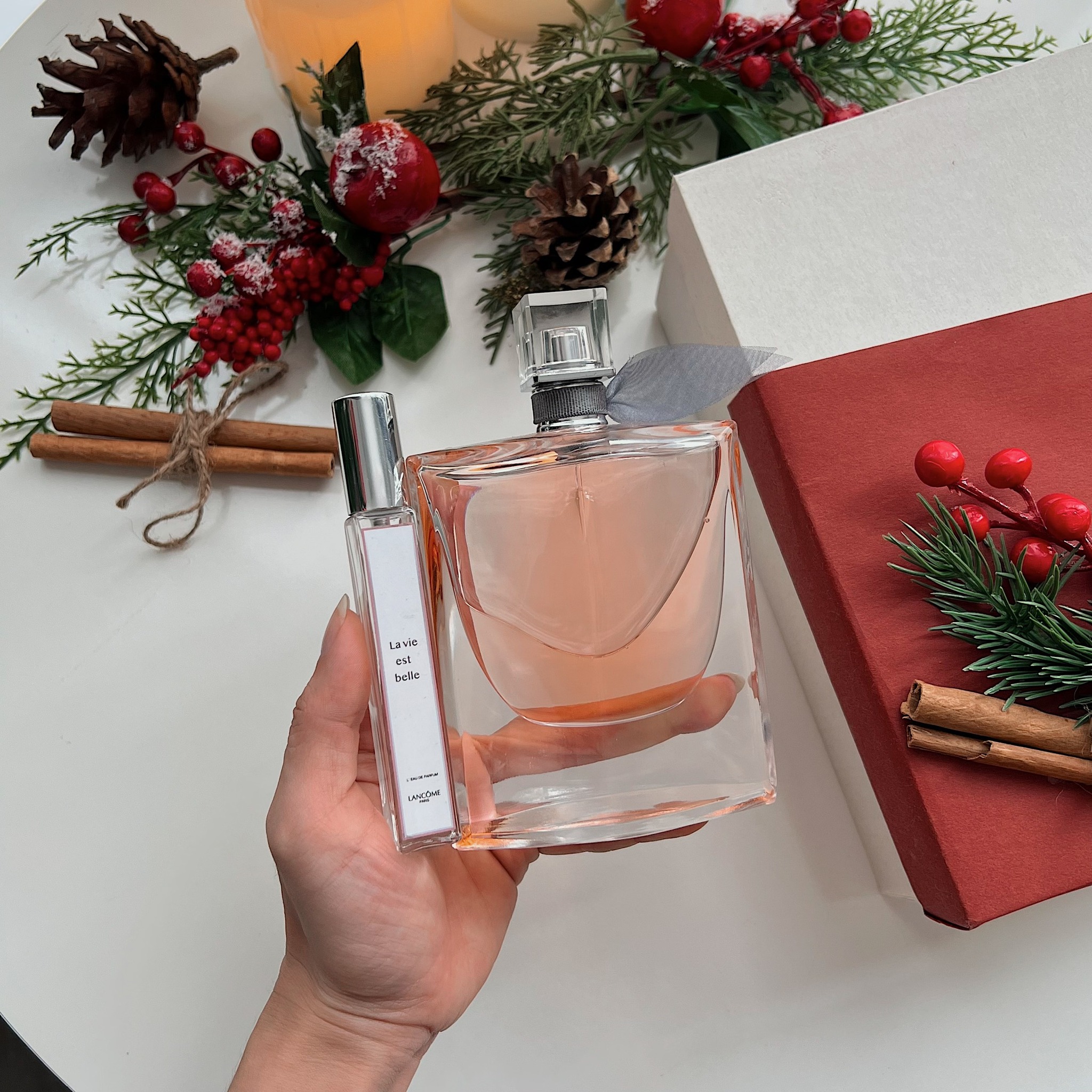 Mang hương vị ngọt ngào của nho đen và lê, nhưng vị ngọt của La vie est belle lại dai dẳng và đậm đà với sự góp phần của chocolate hạt dẻ. Hương giữa là Iris, hoa cam và nhài và cuối cùng phai ra Patchouli, đậu Tonka, vani và Praline.