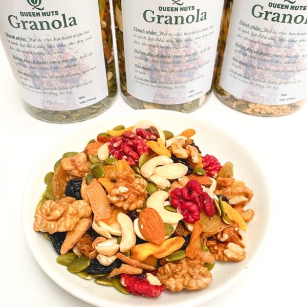 Granola được coi là “trái tim” của những người ăn chay. Chúng bao gồm các loại hạt khô, ngũ cốc, yến mạch, trái cây sấy khô và đôi khi là mật ong. Granola có mùi thơm, đậm đà, giàu chất xơ và chất dinh dưỡng. Vì vậy, món ăn này nhanh chóng trở thành món khoái khẩu của nhiều người.