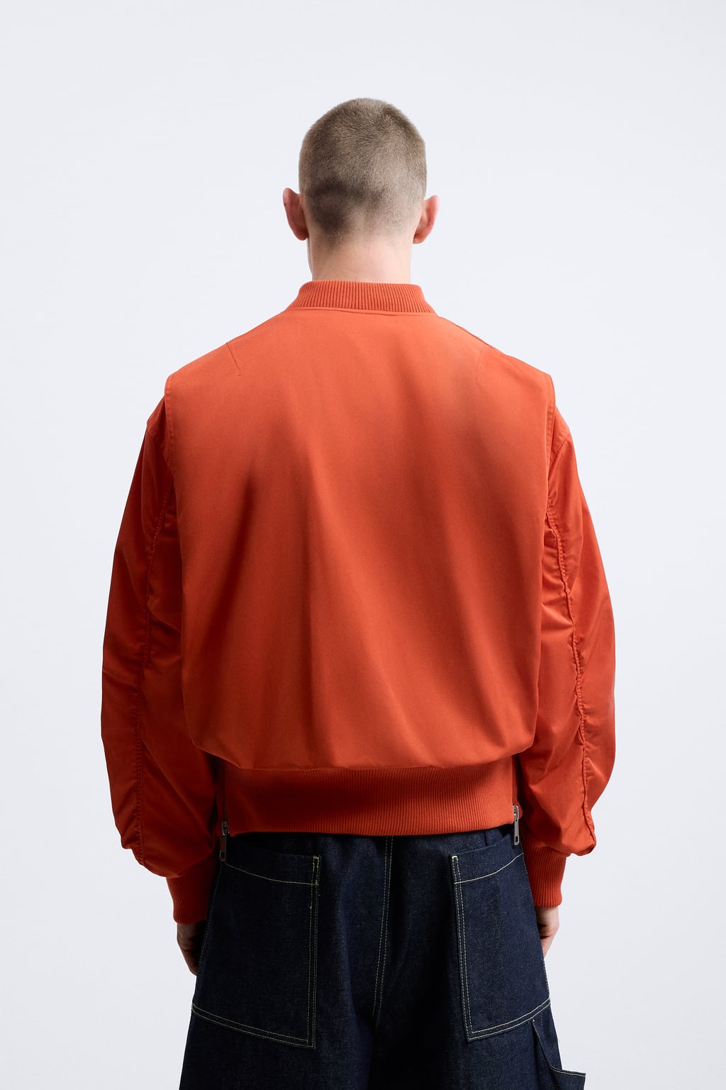 Áo khoác vải kỹ thuật. Cổ cao, dài tay, có túi ở một bên tay áo. Có túi có nắp hai bên hông. Bo viền bằng vải gân. Gấu áo điều chỉnh được bằng khóa kéo ở hai bên. Cài phía trước bằng khóa kéo.