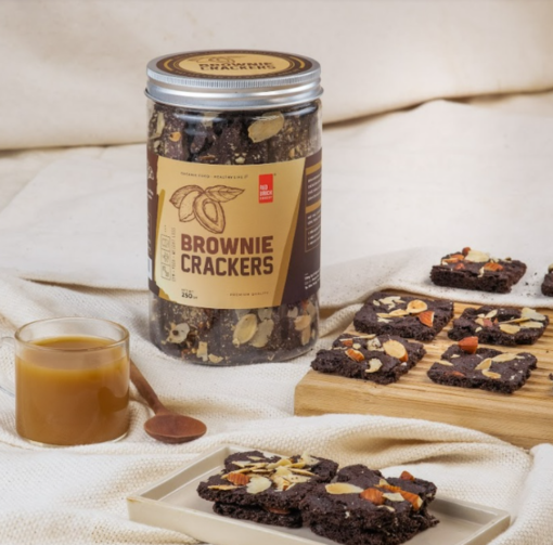Brownie Crackers chocolate nguyên chất: Bánh nhà Gạch Đỏ sử dụng nguyên liệu gồm mật ong, chocolate 70% cacao, lòng trắng trứng, bơ thực vật, bột gluten free.