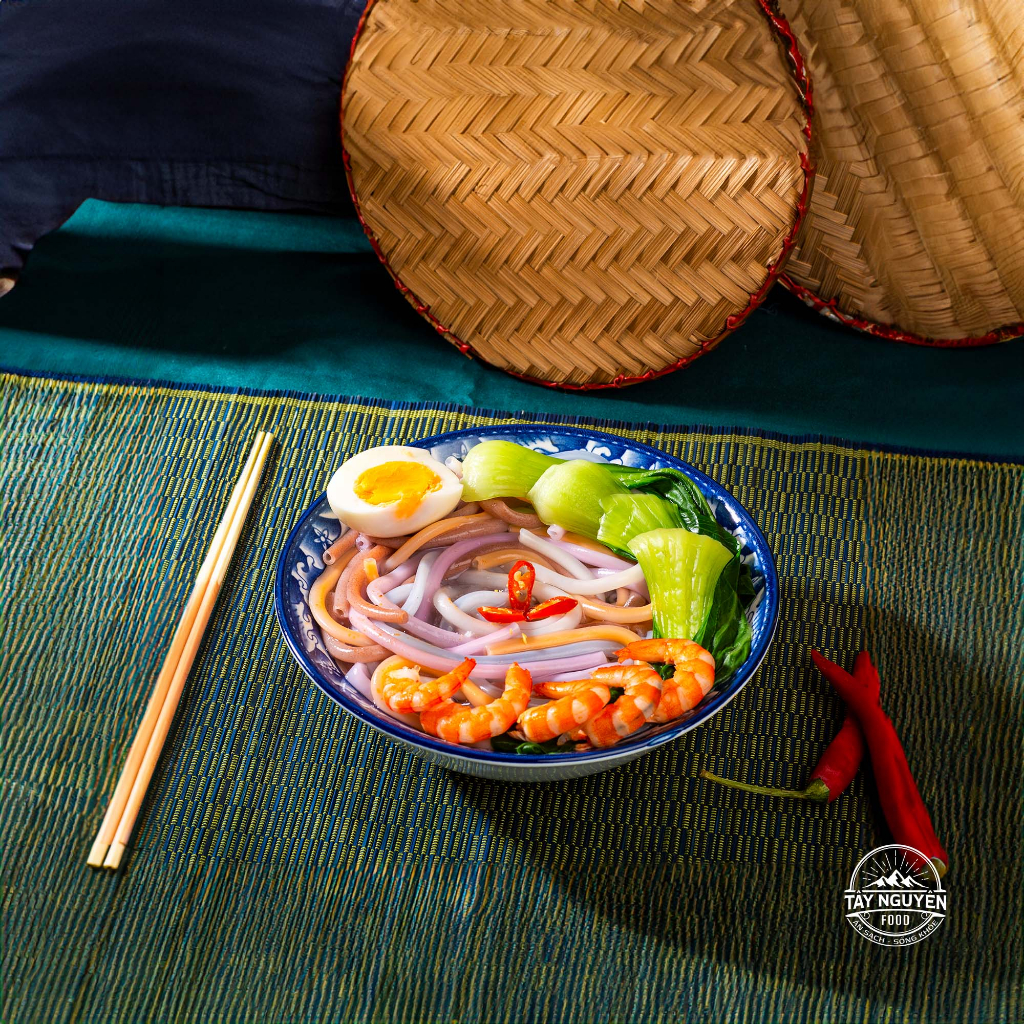 Sản phẩm được làm hoàn toàn tự nhiên, không sử dụng phẩm màu, chất bảo quản, chất tạo độ dai hay bất kỳ hóa chất độc hại nào. Khi nấu lên sợi vừa dai vừa mềm, hương vị vẫn giữ trọn tinh túy từ các nguyên liệu thuần tự nhiên.