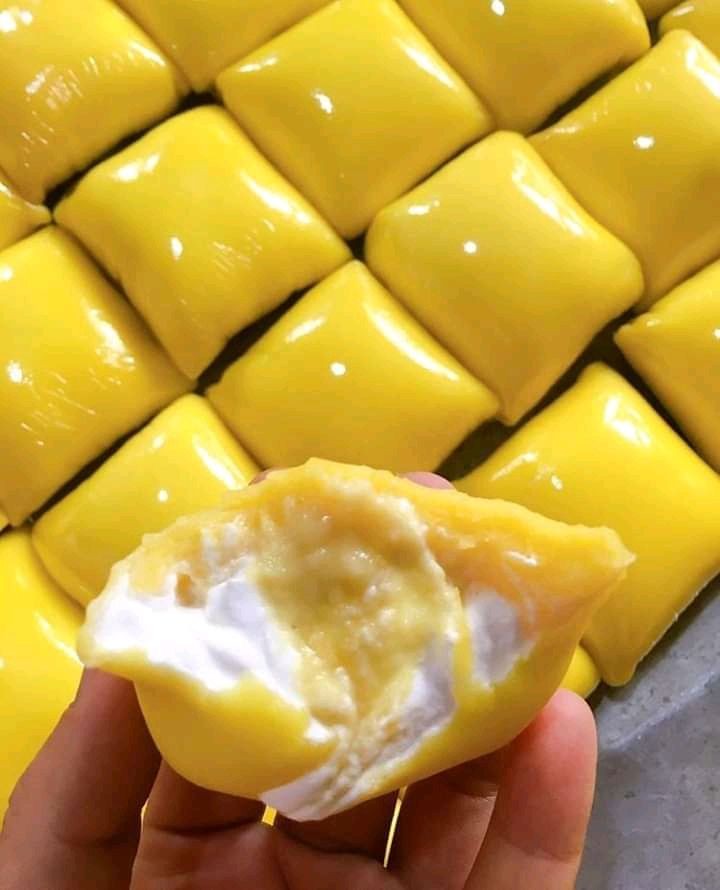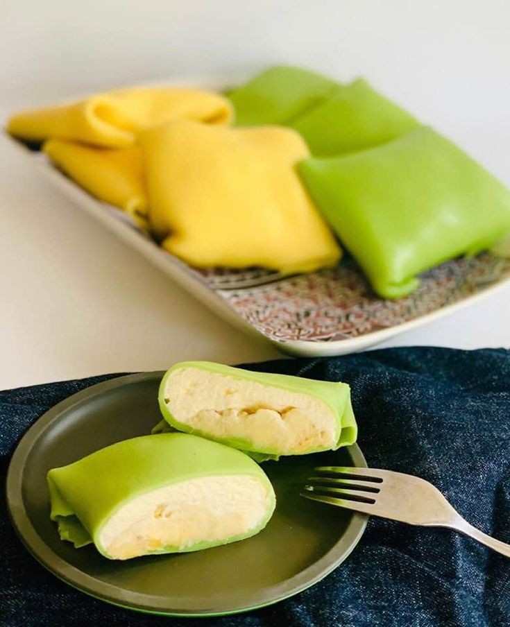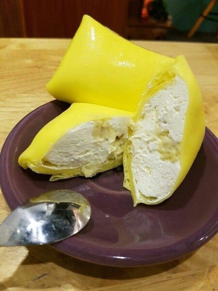 • Cho vỏ bánh đã làm ở bước 2 lên mặt phẳng hoặc một chiếc thớt. Cho phần nhân kem sầu riêng vào giữa vỏ bánh rồi gấp lại cho vuông vắn.