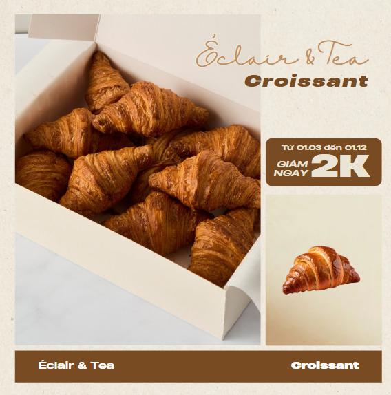 Mô tả: Những chiếc croissant vàng ươm với lớp vỏ giòn tan, xốp mềm bên trong, thơm lừng mùi bơ sữa Pháp đặc trưng. Khi cắn vào, bạn sẽ cảm nhận ngay vị béo ngậy và hương thơm quyến rũ lan tỏa trong miệng. Thích hợp dùng làm bữa sáng, ăn nhẹ hoặc kết hợp cùng trà, cà phê cho buổi chiều thêm trọn vẹn.