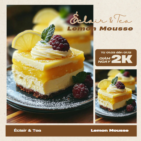 Mô tả: Chiếc bánh mang hương vị tươi mới của lớp mousse chanh vàng mềm mịn, chua nhẹ, hòa quyện cùng phần đế bánh giòn xốp và lớp kem béo ngậy. Trang trí với lát chanh tươi, quả mọng và lá bạc hà, tạo nên tổng thể tinh tế và cuốn hút.