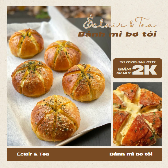 Mô tả: Chiếc bánh mì bơ tỏi hấp dẫn với lớp vỏ vàng giòn, bên trong mềm mại và thơm ngậy. Nhân bánh được rưới đều hỗn hợp bơ tỏi mặn ngọt đậm đà, xen kẽ phô mai béo ngậy, mang đến hương vị bùng nổ ngay từ miếng đầu tiên. Đây là món ăn lý tưởng cho những tín đồ bánh mặn, phù hợp dùng vào bữa xế hoặc mang theo picnic.