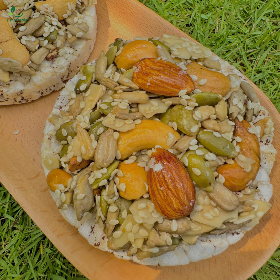 Sản phẩm này được làm từ các loại hạt dinh dưỡng như hạt óc chó, hạt hạnh nhân, hạt macca, và nhiều loại hạt khác. Những hạt này là nguồn tốt của dưỡng chất như chất béo lành, protein, vitamin, và khoáng chất, giúp cung cấp nhiều lợi ích cho sức khỏe. Hơn nữa, bánh nổ gạo lứt không thêm đường, giúp bạn tránh xa các loại đường có hại.
