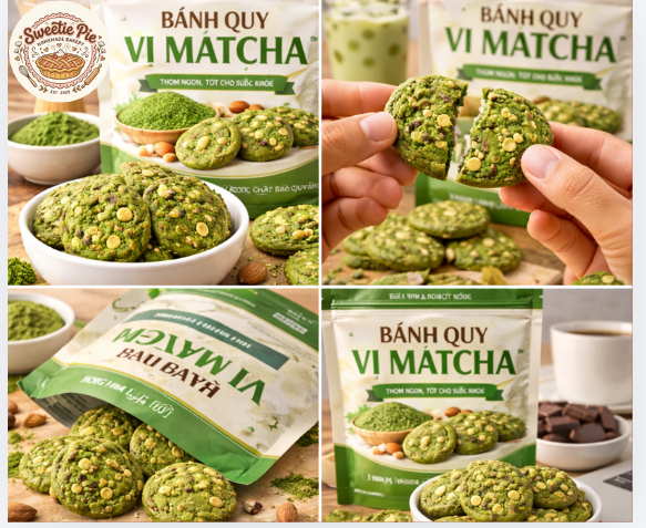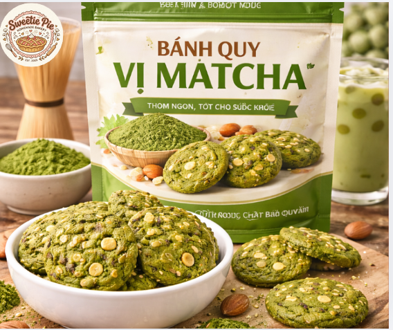 Bánh quy vị matcha là sự kết hợp tinh tế giữa nghệ thuật làm bánh hiện đại và hương vị truyền thống của trà xanh Nhật Bản. Ngay từ cái nhìn đầu tiên, bánh gây ấn tượng với màu xanh tự nhiên đặc trưng của matcha, mang lại cảm giác thanh mát, nhẹ nhàng và đầy cuốn hút.