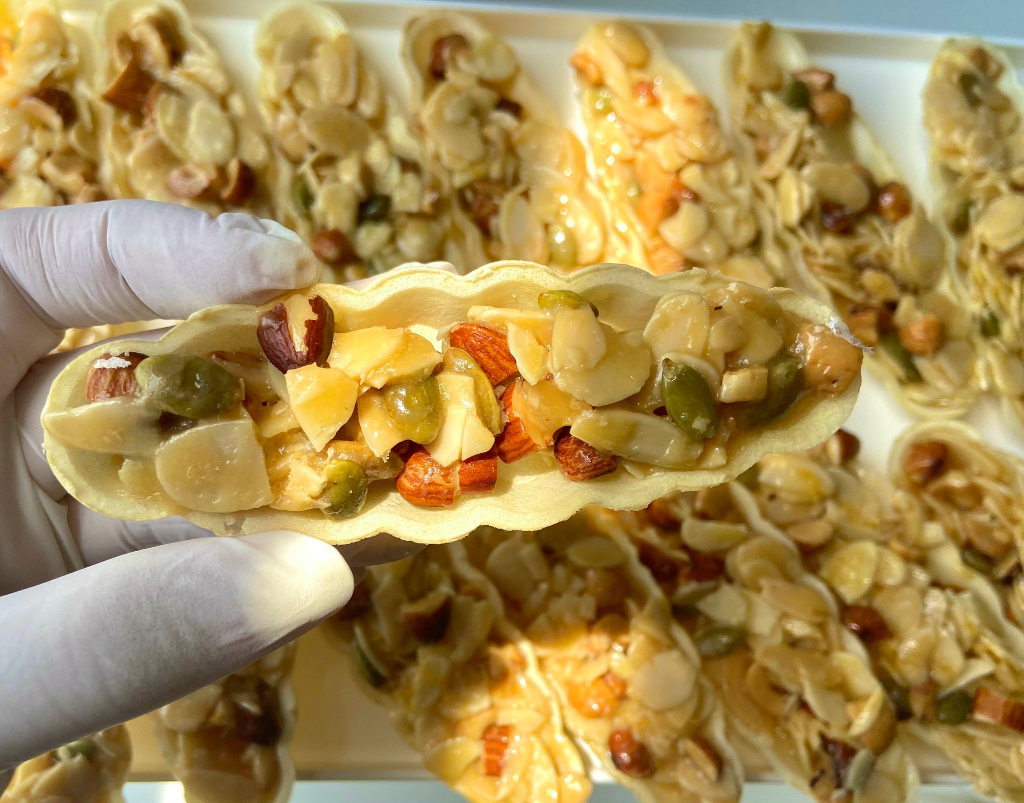 Thành phần: Bánh được làm handmade với hơn 5 loại: Hạt hạnh nhân, hạt macca, hạt điều, hạt dưa, nho Mỹ,... hạt thơm bùi tuyển chọn từ quê hương DakLak, mang vị ngọt tự nhiên từ các loại hạt, độ giòn thơm vừa phải, không sử dụng đường, cực kì lành.