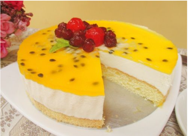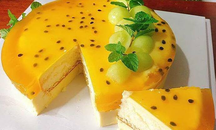 Bước 7: Đặt bánh vào tủ lạnh 1 giờ cho phần kem phô mai cứng lại, sau đó bạn lấy bánh ra, múc ruột chanh dây phủ đều lên mặt bánh là hoàn tất.