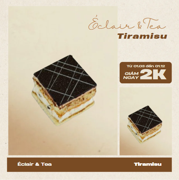 Mô tả: Chiếc bánh Tiramisu với lớp kem mascarpone mềm mịn, quyện cùng vị cà phê espresso đậm đà, xen kẽ cốt bánh ladyfinger thấm nhẹ rượu rum và phủ lớp cacao tinh tế. Tiramisu mang đến trải nghiệm vị giác cân bằng giữa vị béo, đắng nhẹ và ngọt dịu – một lựa chọn lý tưởng cho những buổi trà chiều đầy cảm hứng.
