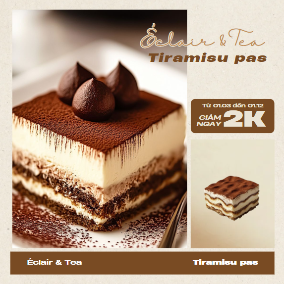 Mô tả: Chiếc bánh Tiramisu Pas được làm từ lớp kem mascarpone mềm mại, xen kẽ cốt bánh ladyfinger thấm đẫm cà phê và rượu nhẹ, phủ trên cùng là bột cacao và socola truffle tan chảy. Với sự kết hợp hài hòa giữa vị béo, vị đắng nhẹ và hương rượu tinh tế, Tiramisu Pas là món tráng miệng lý tưởng cho những ai yêu thích sự thanh lịch và đầy cảm xúc.