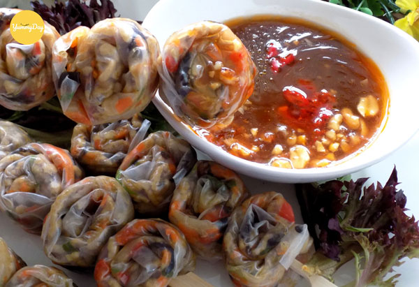 Món ăn này có lớp vỏ bánh tráng dẻo dai, bên trong gồm những topping như thịt nạc, củ sắn, nấm mèo. Tất cả nguyên liệu được nêm nếm vừa vặn, cho ra hương vị đậm đà mà mỗi khi thưởng thức bạn chẳng thể nào ngừng đũa được.