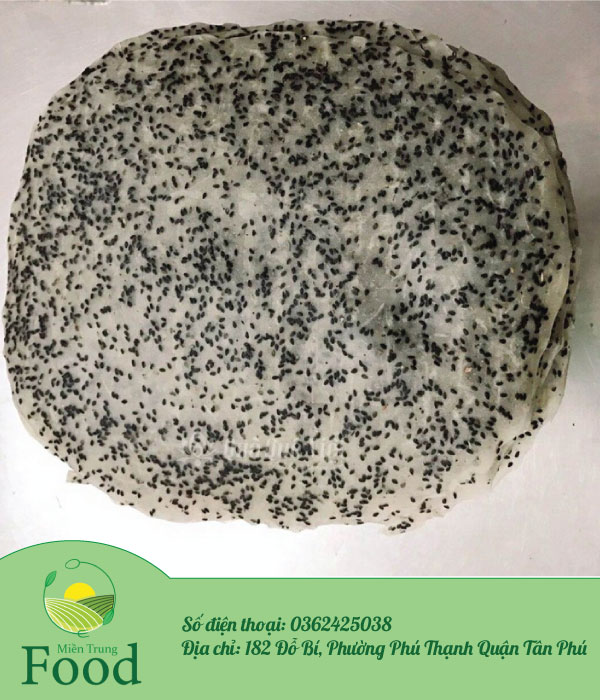 Bánh Tráng Nướng Mè Đen. Được làm từ nguyên liệu chính là bột gạo pha lỏng vừa phải với nước, mè đen. Bánh được làm hoàn toàn thủ công, nguyên liệu 100% gạo quê. Sau khi tráng mỏng thì được đem đi phơi khô. Bánh tráng gạo mè đen là loại bánh dày nhiều mè đen có kích thước lớn, khi nướng lên có mùi thơm nồng, ăn rất ngon và giòn.