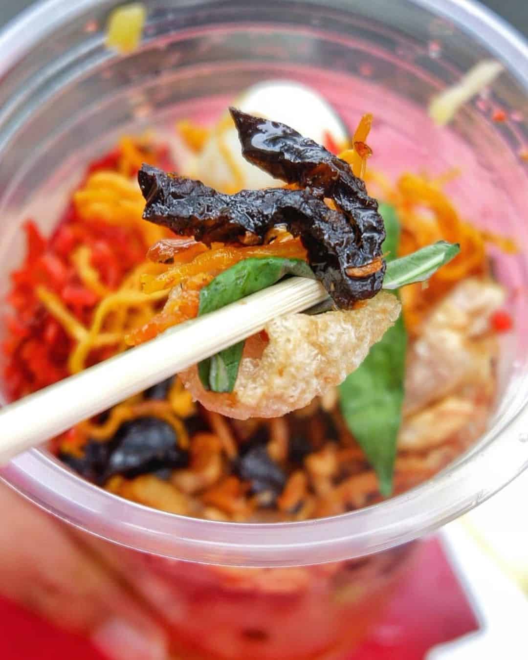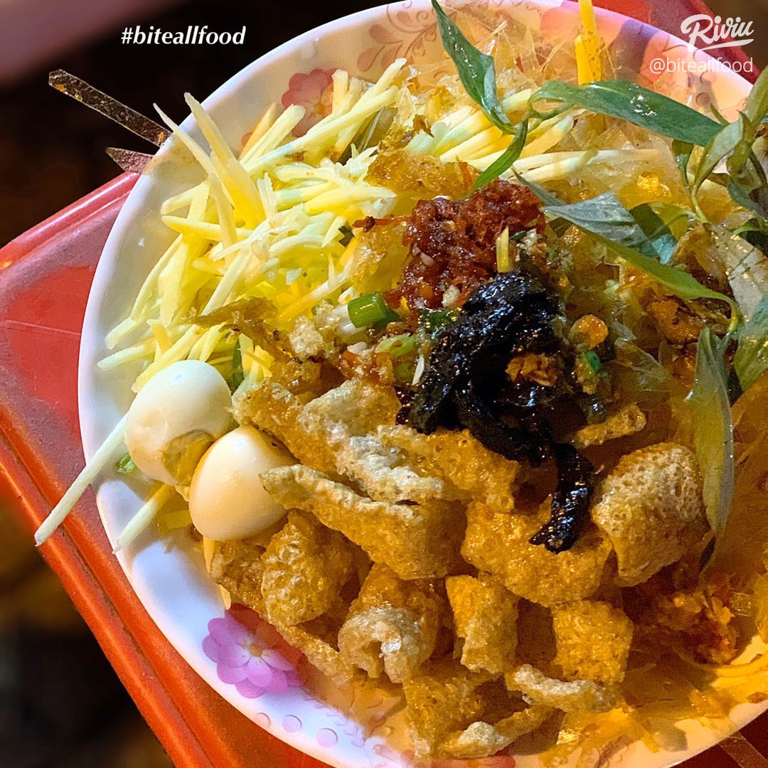 Đầu tiên là vị dai của bánh tráng, vị mặn, thơm của trứng, da heo và ruốc khô, cùng mùi thơm của đậu phộng và hành phi. Đâu đó phảng phất cái cay nồng của ớt, mùi hăng tự nhiên của rau răm và vị chua ngọt dễ chịu của sốt me được pha chế đặc biệt