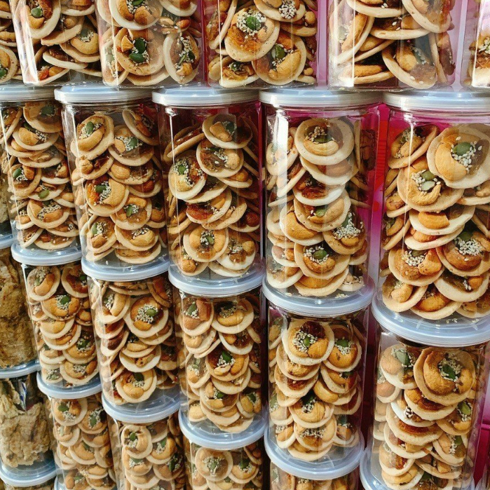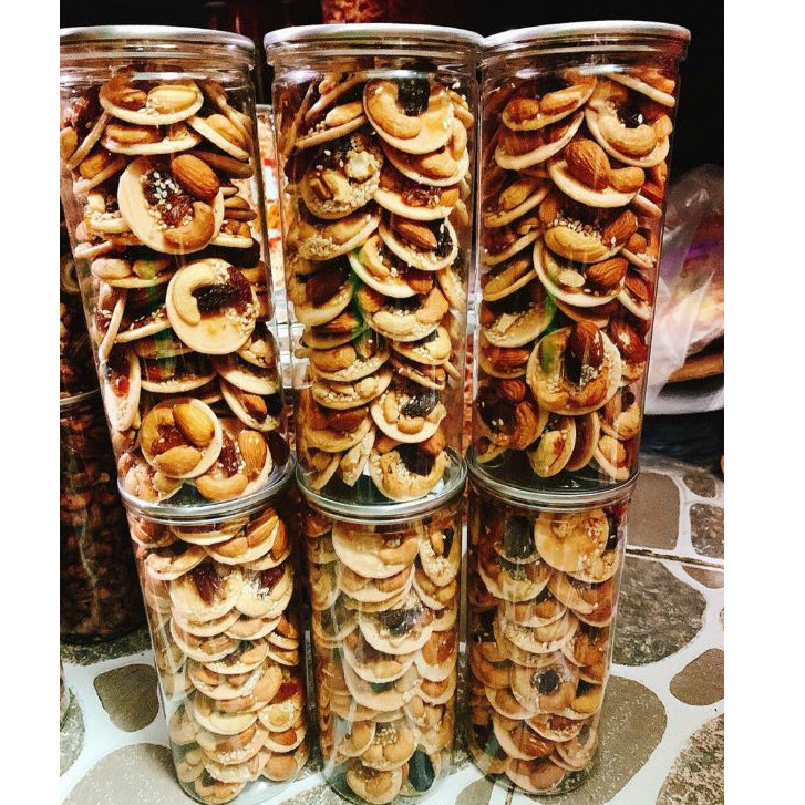 Thành phần: hạt điều, bí xanh, hạt mè, nho khô, hạnh nhân (sẽ ngẫu nhiên bánh có hạt hạnh nhân, bánh không có hạt)