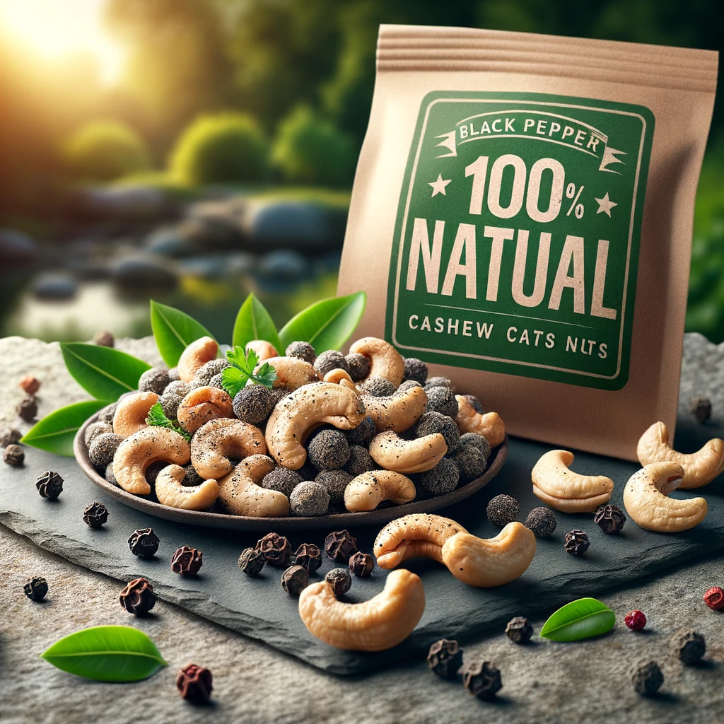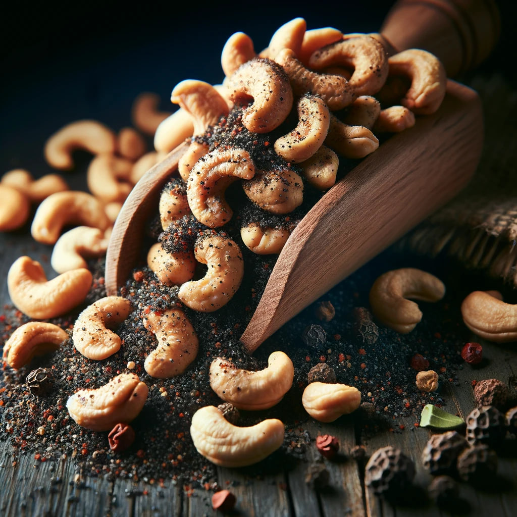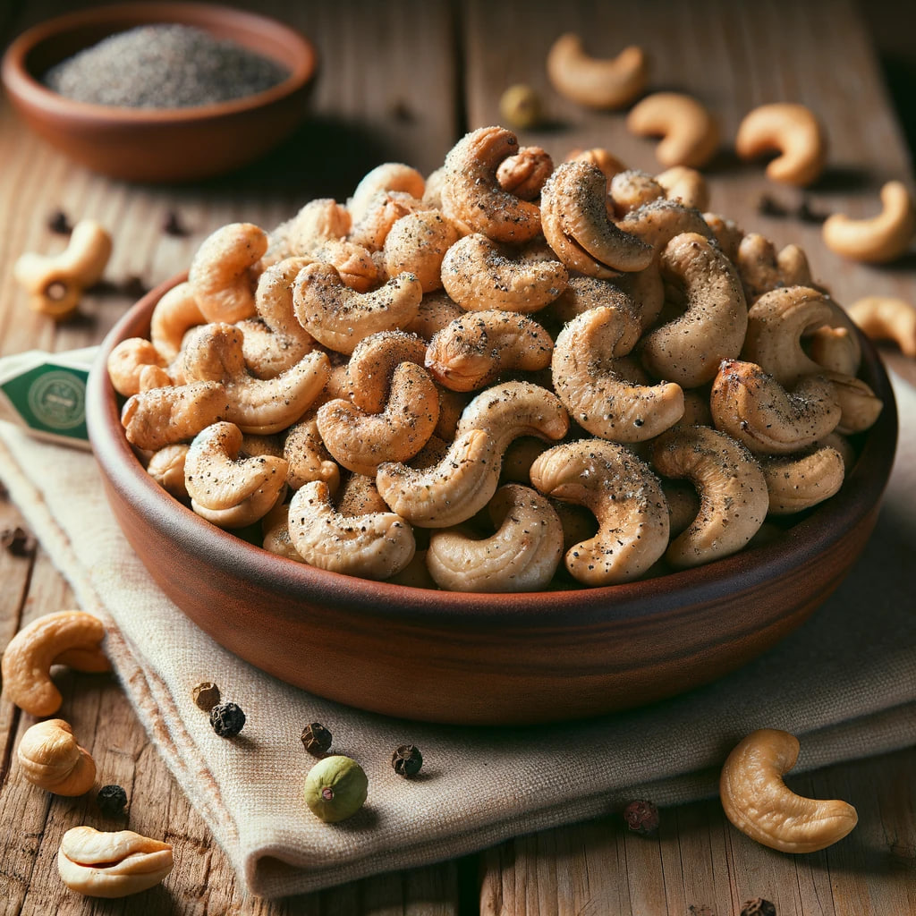 Hạt điều được phủ một lớp tiêu đen mịn, tạo ra một hương vị cay nồng đặc trưng, kích thích vị giác.