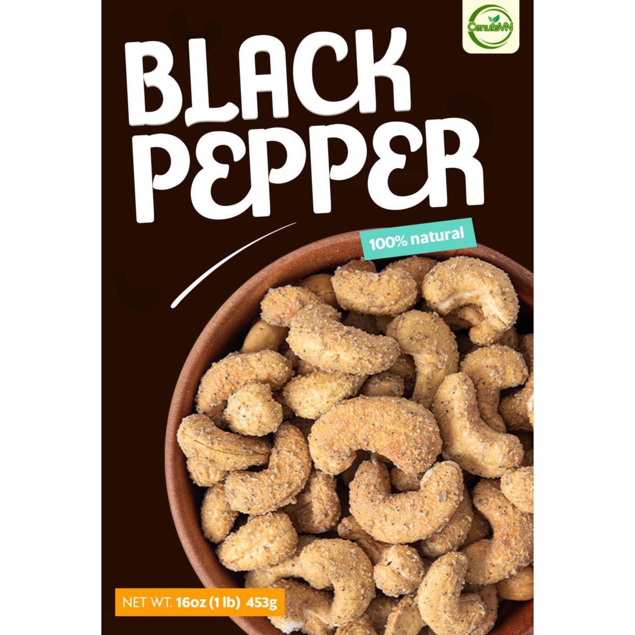 Đây là hạt điều phủ tiêu đen, mỗi gói nặng 16oz (khoảng 453 gram), được đánh dấu là sản phẩm "100% tự nhiên".