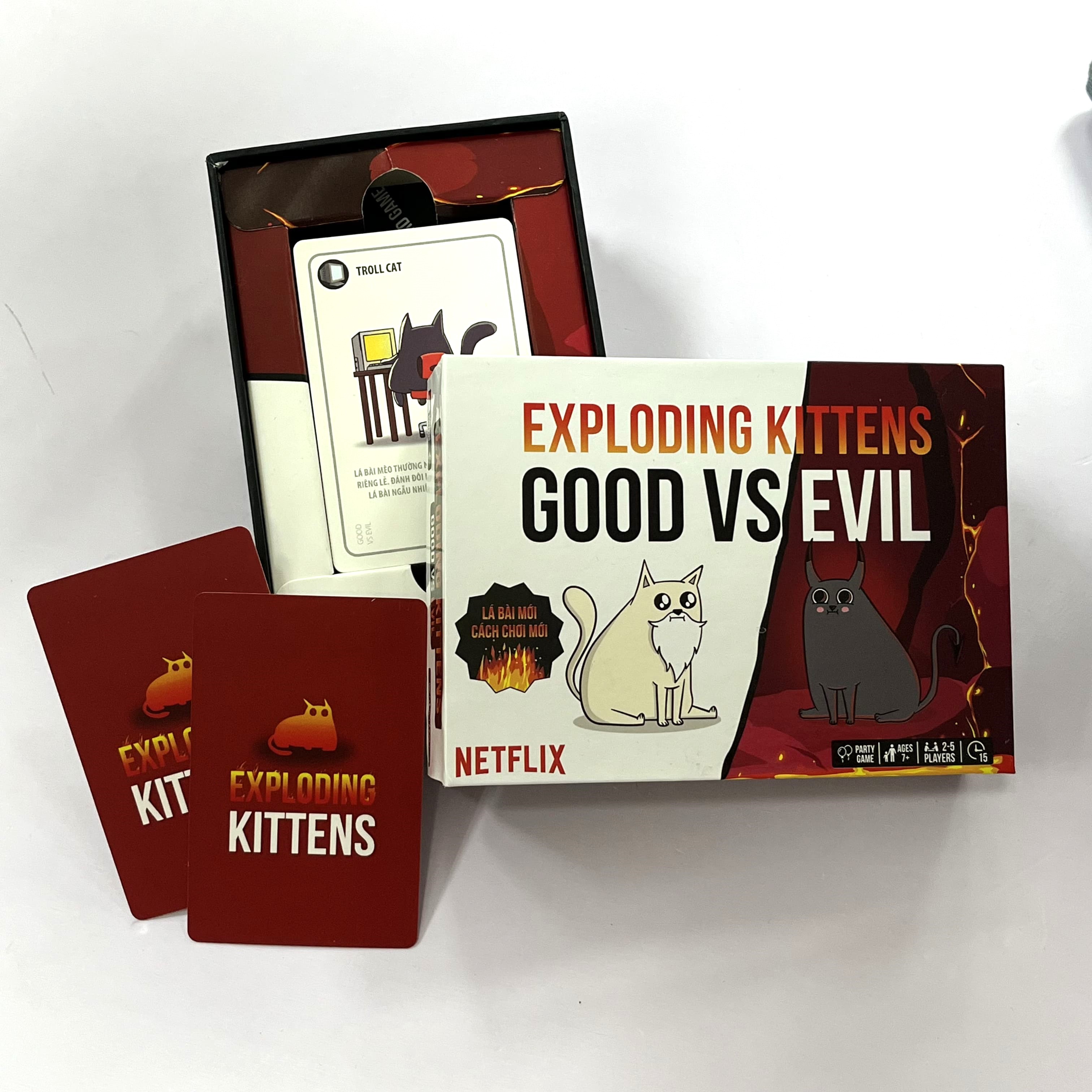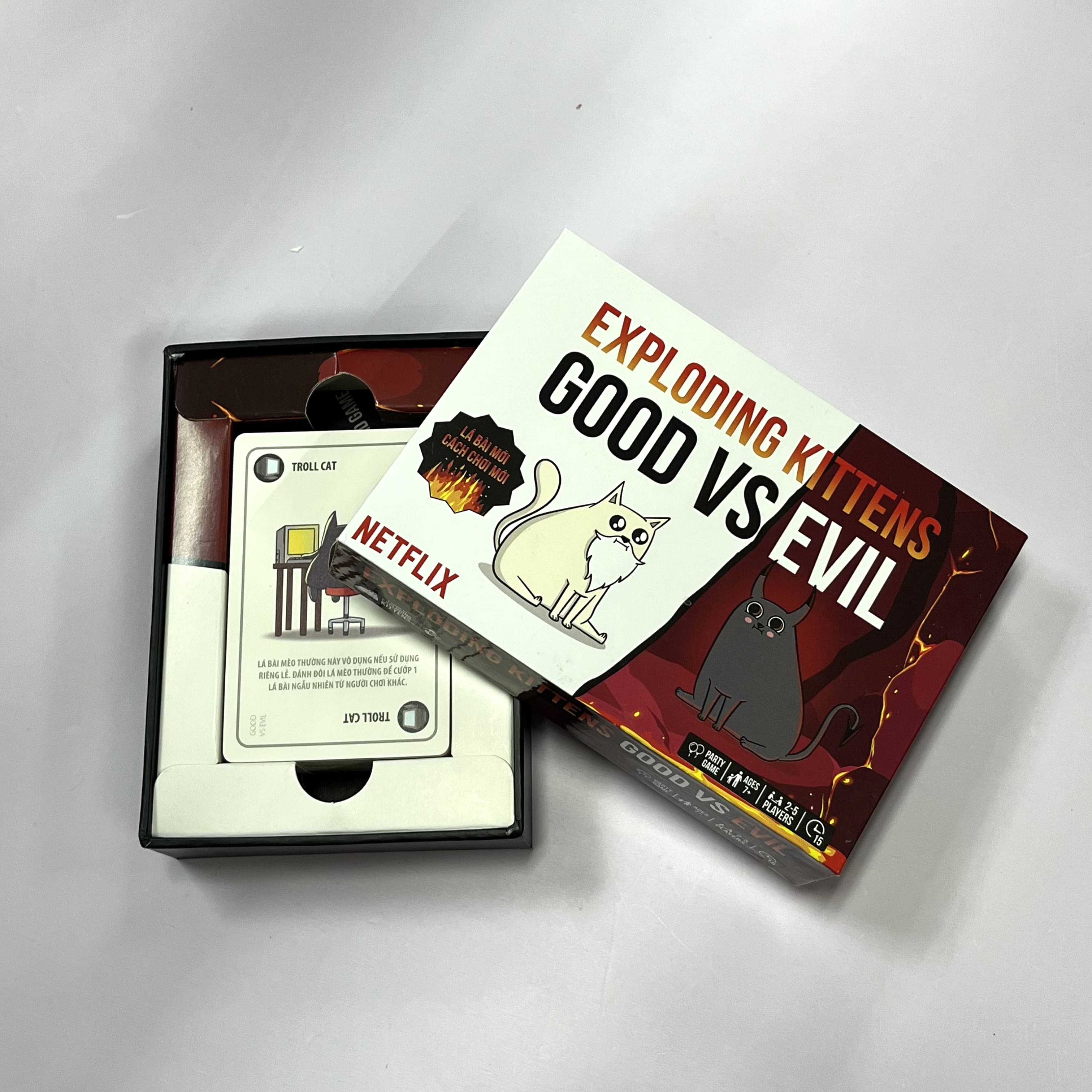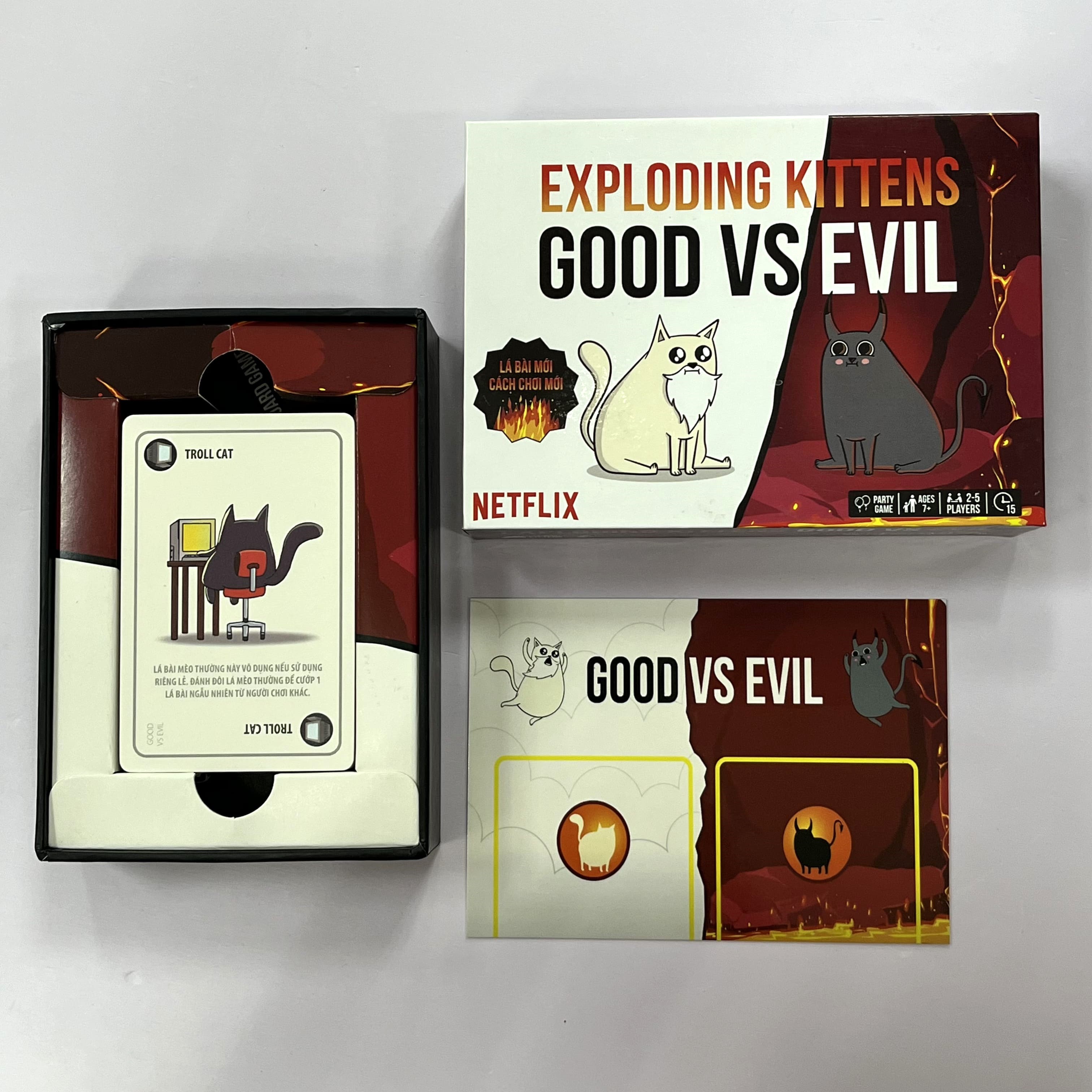Exploding Kittens: Good vs. Evil là phiên bản Mèo nổ mới nhất với nhiều nhân vật và luật chơi mới hoàn toàn. Kết hợp với trò chơi Roulette khiến cuộc chơi trở nên phụ thuộc vào độ “ăn ở” để ông bà phù hộ, bên cạnh đó là việc gây chiến và tổ chức các trận chiến hoành tráng của riêng mình…để cố gắng không phát nổ!