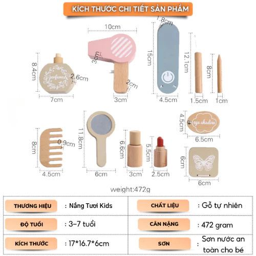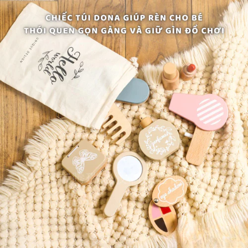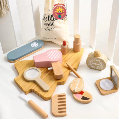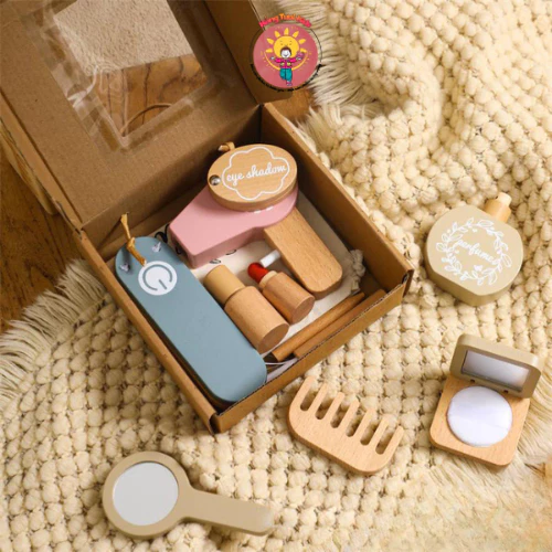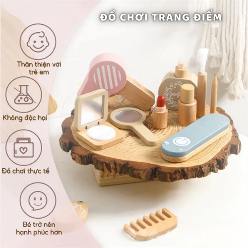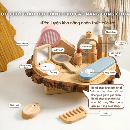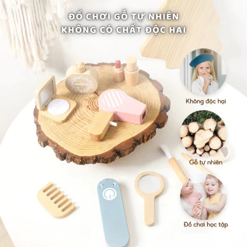 - 7 món đồ trang điểm: Bao gồm son, gương, lược, hộp phấn, lọ nước hoa, dây đeo và túi xách, khuyến khích bé giả lập vai trò và sáng tạo phong cách. - Triết lý Montessori: Hỗ trợ phát triển tính tự lập, kỹ năng xã hội và khả năng tập trung thông qua chơi mà học. - An toàn tuyệt đối: Gỗ tự nhiên 100%, không góc cạnh, thân thiện với môi trường. - Thiết kế bắt mắt: Màu sắc tươi sáng, hình dáng ngộ nghĩnh, thu hút bé gái yêu thích làm đẹp.