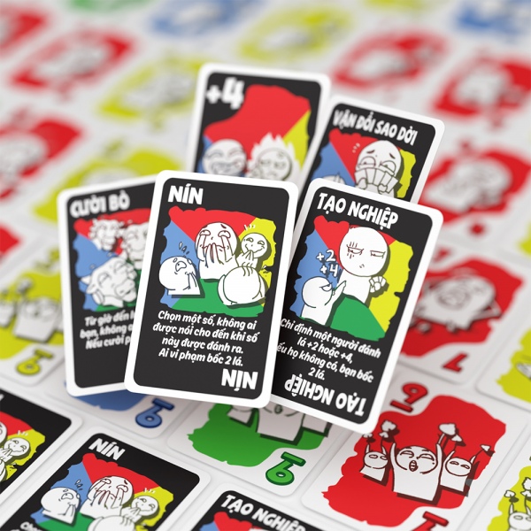 – Tạo nghiệp: Tượng trưng cho tất cả các màu. Chuyển lượt cho 1 người chơi khác, chỉ định người chơi đó phải đánh “+2” hoặc “+4” lên người chơi tiếp theo của vòng. Nếu người chơi đó không thể đánh (kiểm tra bài trên tay), bạn phải rút 2 lá
