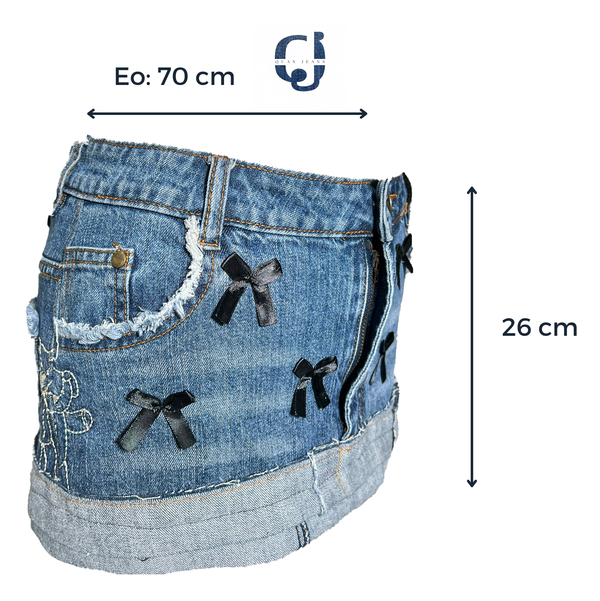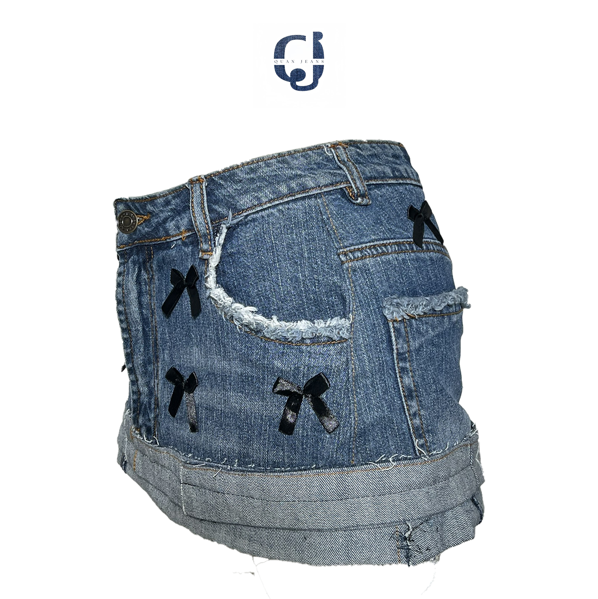 Thiết kế Độc Đáo: Sản phẩm này được thiết kế và custom từ một chiếc quần Jeans cũ và đặc biệt được điểm thêm những chiếc nơ đen tinh tế tăng độ nổi bật, làm tôn lên vẻ đẹp và phong cách cá nhân của bạn.