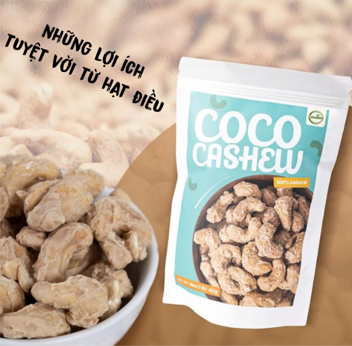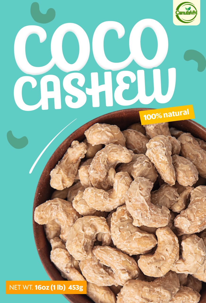 Sản phẩm trong hình là hạt điều vị dừa, được đóng gói với trọng lượng là 16oz (tương đương 453 gram) và được nhấn mạnh là "100% tự nhiên".