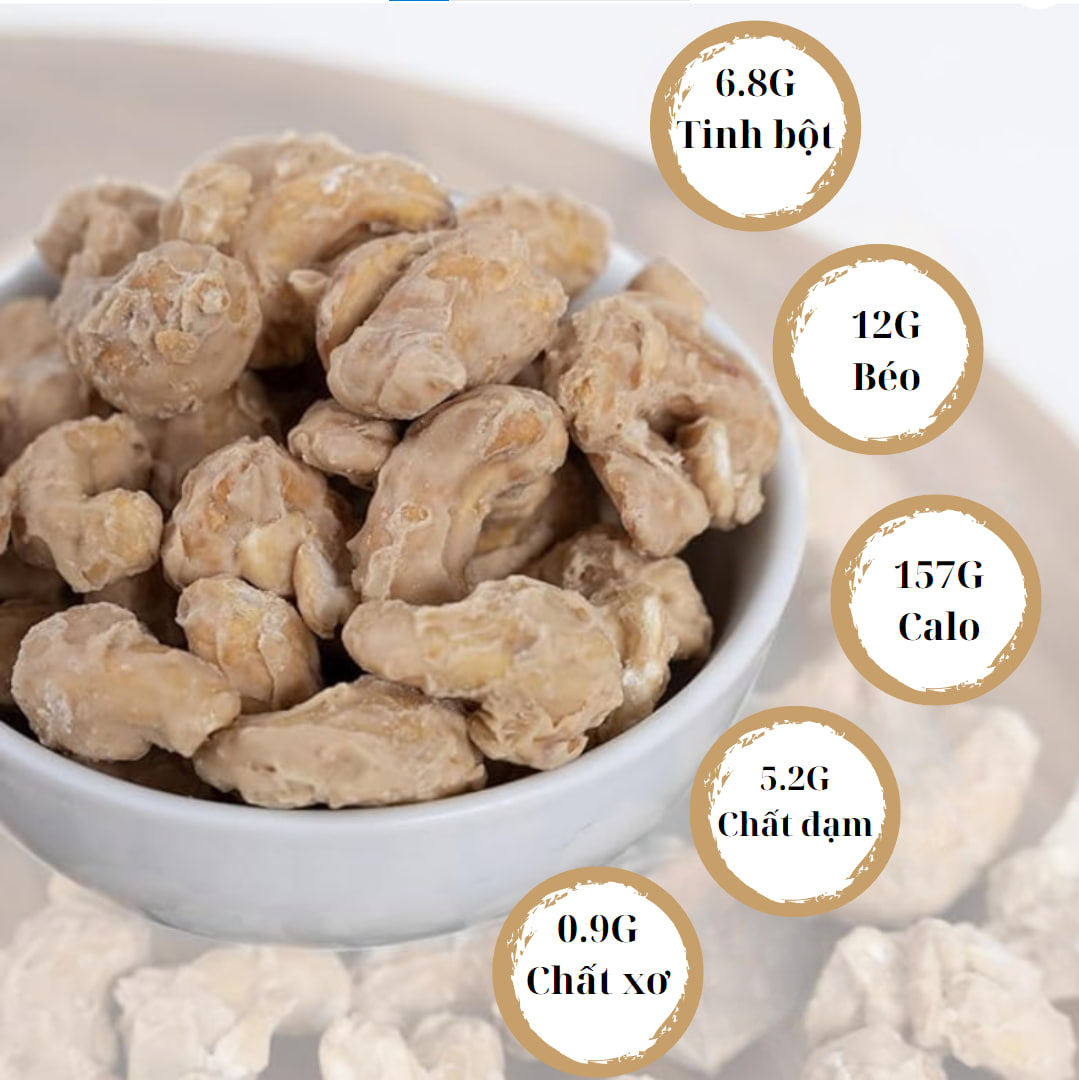 Hạt điều có vẻ ngoài bóng bẩy với lớp phủ mịn màu kem của dừa, cho thấy chúng có thể có vị ngọt nhẹ của dừa hòa quyện với độ béo tự nhiên của hạt điều. Sản phẩm này phù hợp cho những người tìm kiếm một lựa chọn ăn vặt lành mạnh và giàu dưỡng chất.