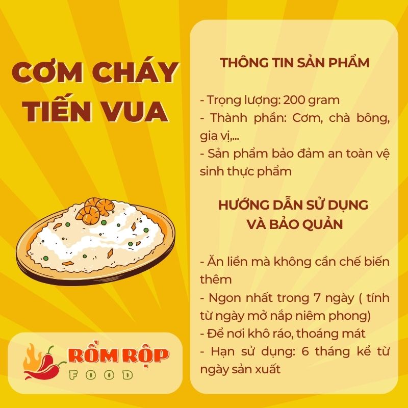Cơm cháy Tiến Vua với thành phần chính là cơm cháy, chà bông và một số gia vị đặc trưng. Đây là món ăn vô cùng nổi tiếng trong giới trẻ Việt Nam.