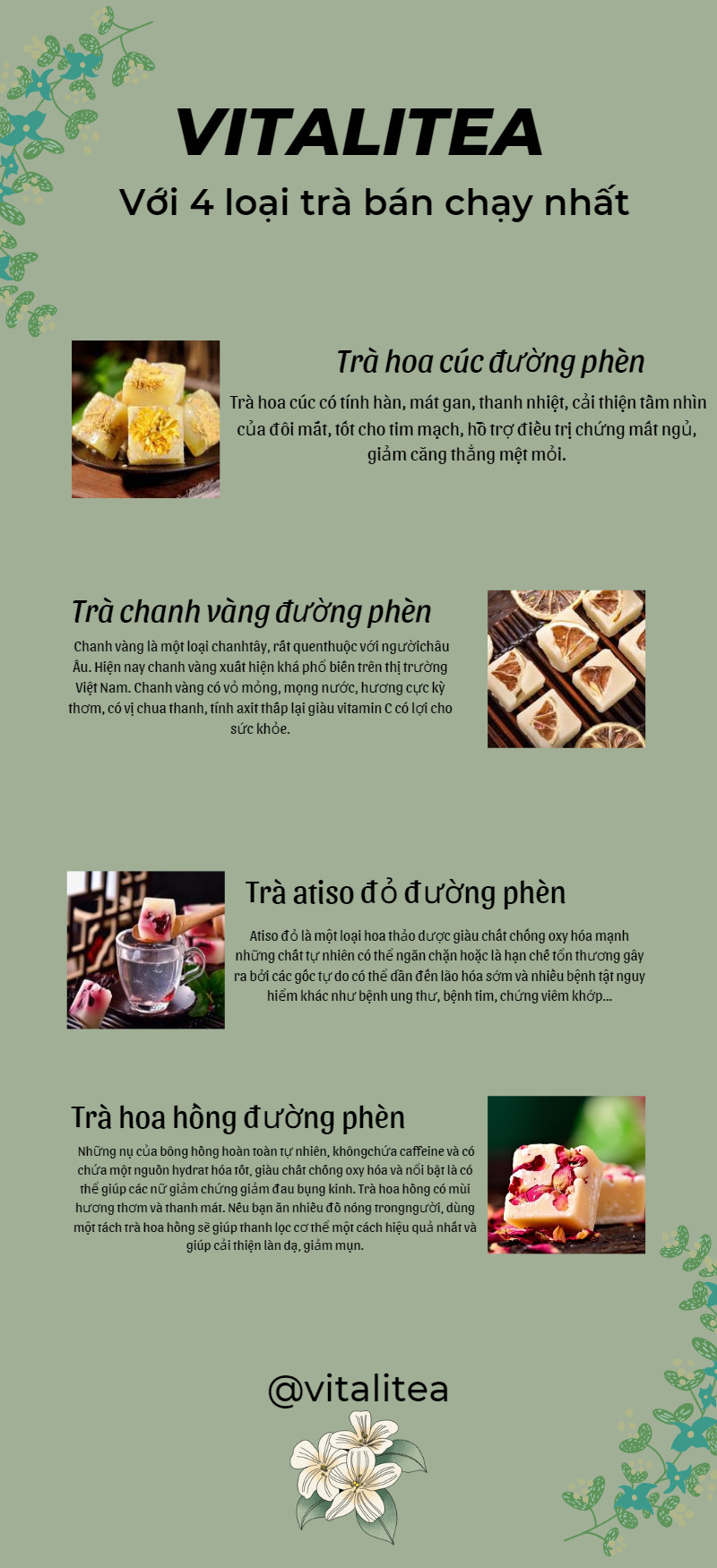 Combo 5 vị tra Vitalitea bao gồm trà hoa cúc, tra hoa hồng, trà atiso đỏ, trà chanh vàng và một viên trà ngẫu nhiên. Vitalitea sản xuất ra combo 5 vị trà nhằm mang đến cho người dùng đa dạng sự lựa chọn hơn, tiết kiệm hơn cũng như nhiều sự "Sống chậm lại - Yên bình hơn" mỗi ngày.