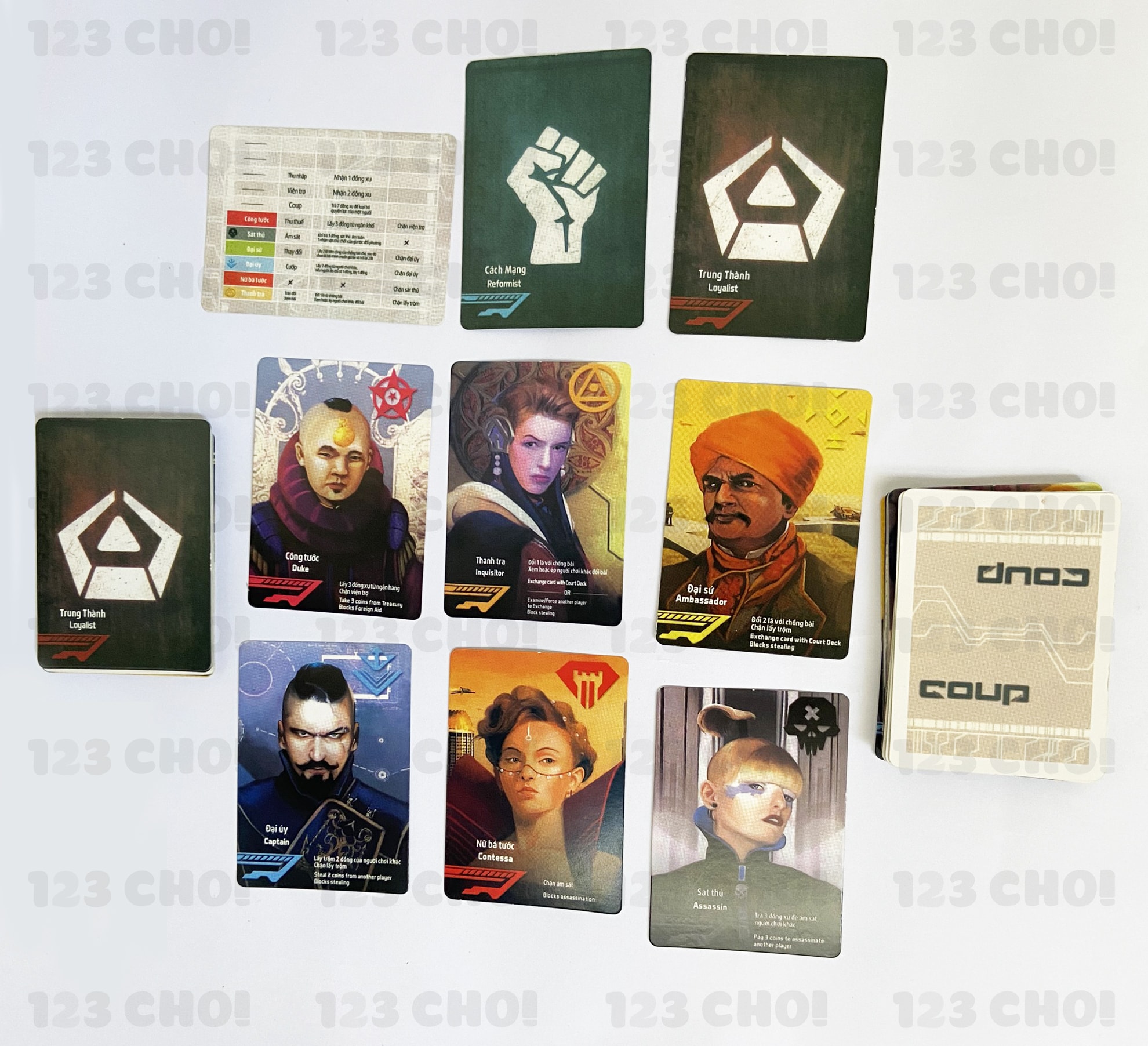 - Mỗi người chơi có 2 thẻ nhân vật úp mặt trong khu vực chơi của mình và được chia 2 đồng tiền