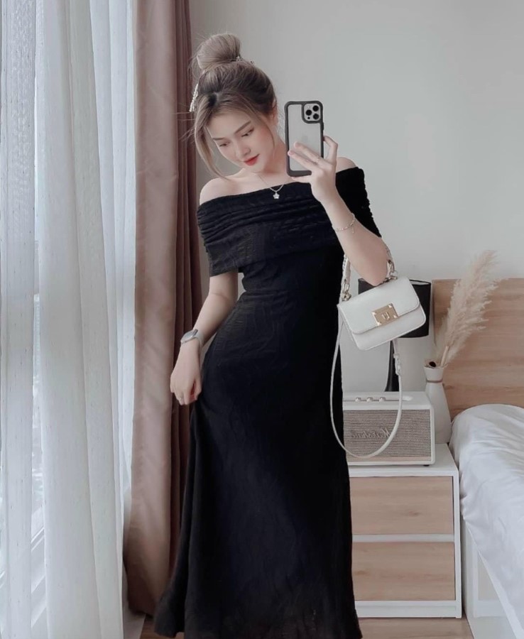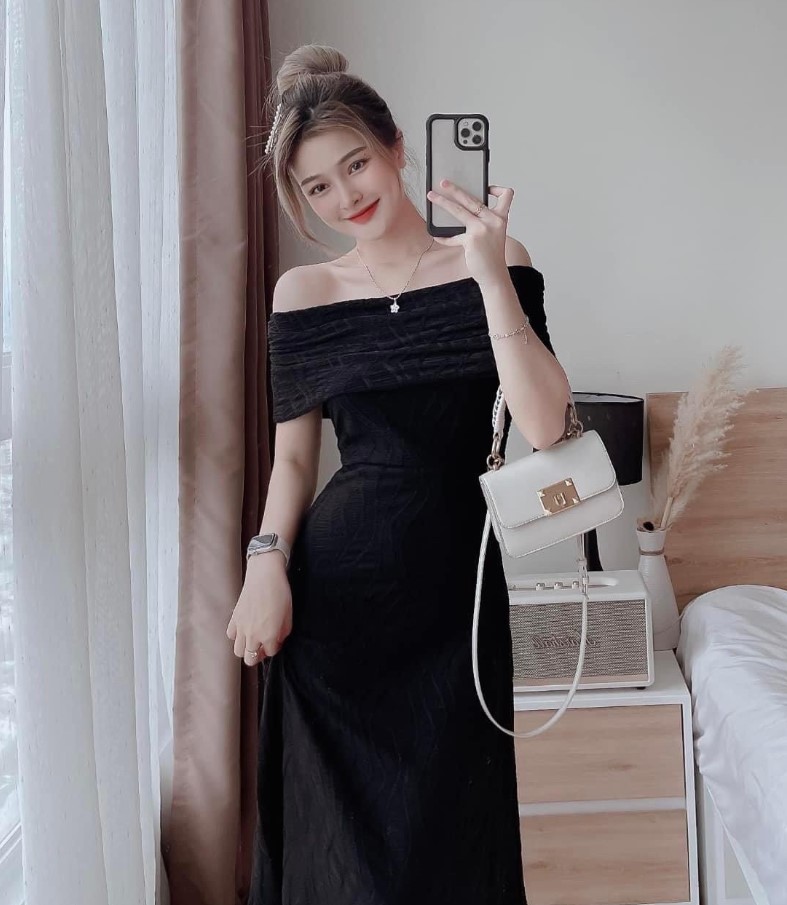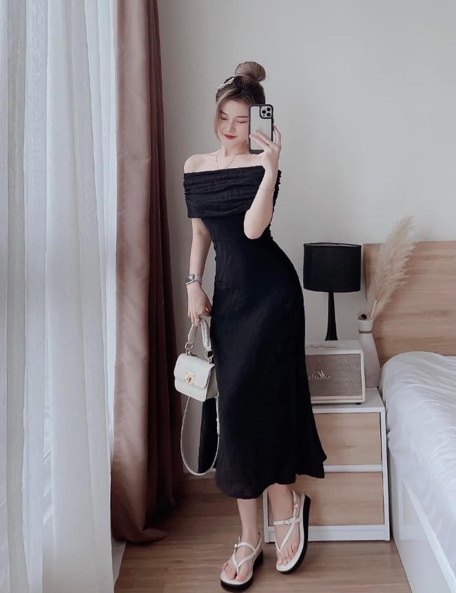 Hết váy đầm trắng thì chúng ta chuyển qua váy đầm đen. Mỗi màu váy đều có ý nghĩa và sắc thái riêng biệt nhưng trắng và đen là 2 màu rất quý phái và dễ phối với các phụ kiện đi kèm như nón, dày cao gót, dây chuyền, túi xách, vòng đeo… Vì vậy trong bộ sưu tập các nàng nên bổ sung cho mình ngay một bộ váy đầm midi đen trễ vai này nhé, đảm bảo khi dự tiệc hết sảy là nổi bật luôn.