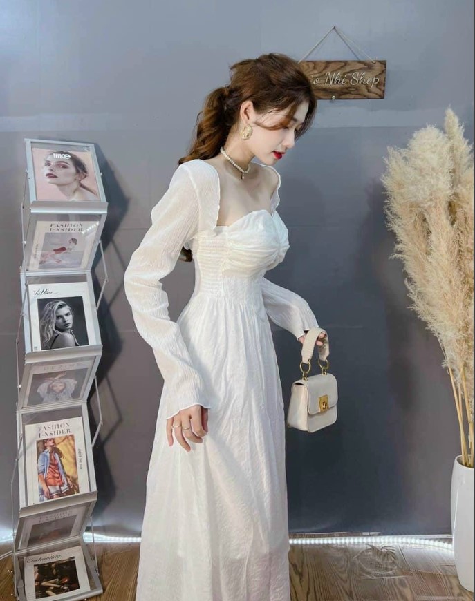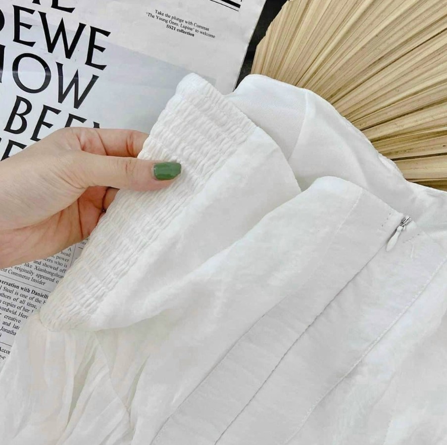 Đầm midi trắng tay voam ống xoắn kèm croptop