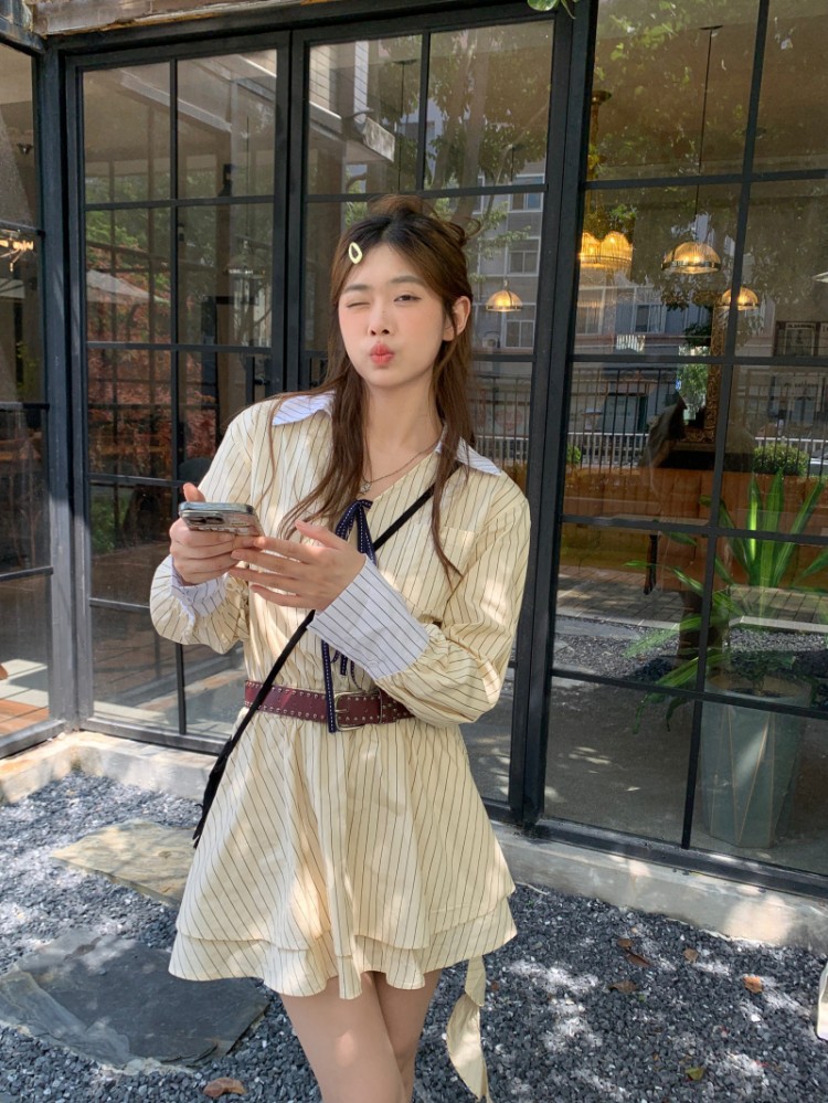 Kiểu dáng: Váy sơ mi sọc cổ nơ màu vàng sáng