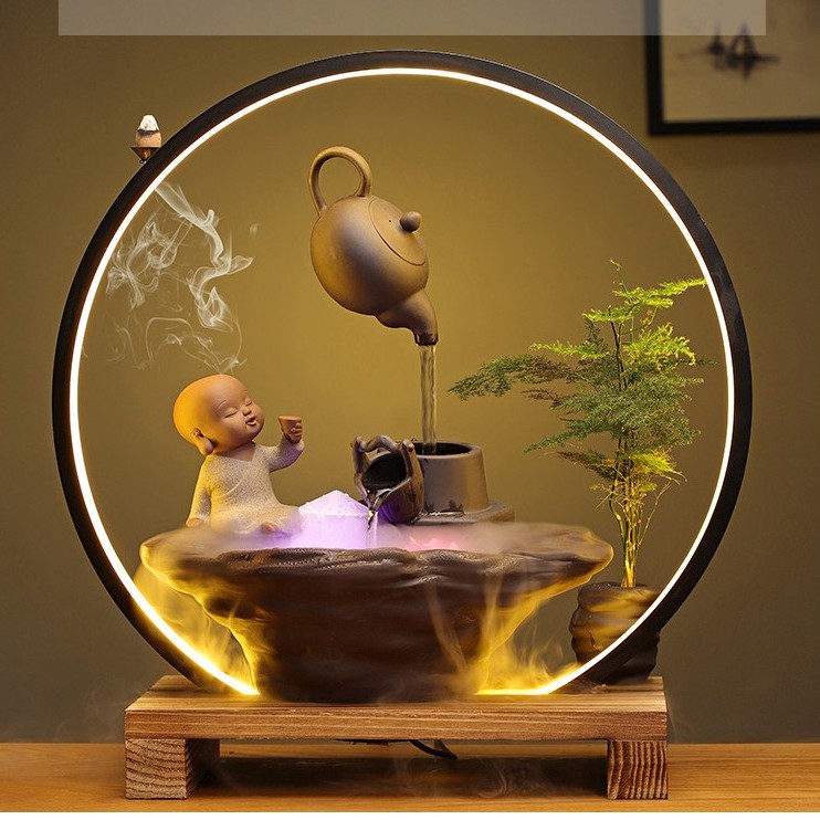 Đèn led thác nước với hình ảnh chú tiểu ngồi thiền tịnh cạnh cây cổ thụ chảy nước tạo nên một tổng thể vô cùng đẹp mắt và ấn tượng, tiếng suối chảy róc rách, cảnh sắc thiên nhiên thật an bình, khoan thai không muộn phiền, lo âu.
