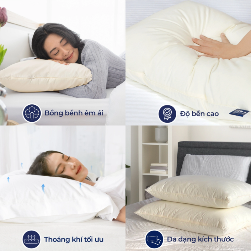Lớp vỏ gối cotton poly cao cấp có khả năng kháng khuẩn tự nhiên, hạn chế tích tụ bụi và nấm mốc – đặc biệt phù hợp với người có làn da nhạy cảm hoặc bị viêm mũi dị ứng.
