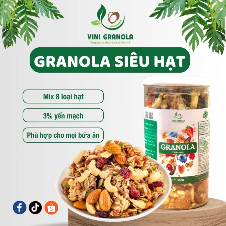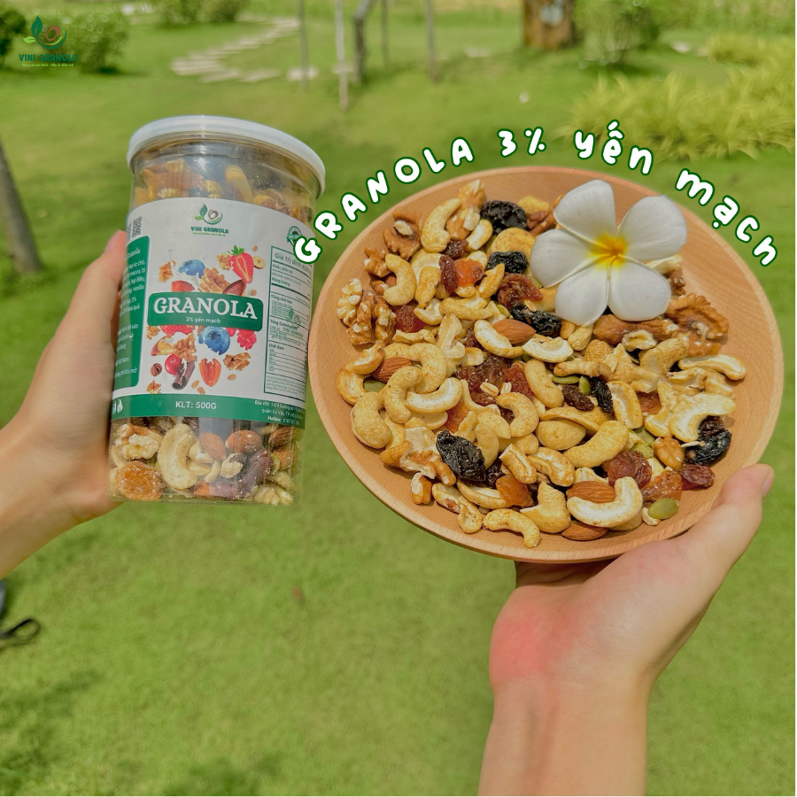 Granola Siêu Hạt 3% Yến Mạch là một loại nguồn thực phẩm giàu dinh dưỡng. Yến mạch nổi tiếng với khả năng tạo cảm giác no lâu, giúp duy trì sự bão hòa trong bữa ăn và hỗ trợ quá trình giảm cân. Sản phẩm này chứa một loạt các hạt dinh dưỡng như hạt hướng dương, hạt lựu, hạt óc chó, hạt mắc ca và nhiều loại hạt khác. Điều này giúp đa dạng hóa nguồn cung cấp dưỡng chất cho cơ thể và hỗ trợ sức khỏe toàn diện.