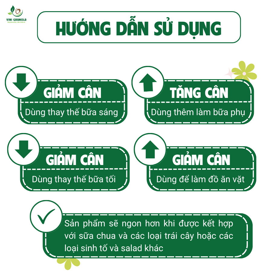 Bạn có thể thưởng thức sản phẩm này như một bữa sáng dinh dưỡng, một món ngon ngọt giữa các bữa ăn, hoặc kết hợp với sữa tươi, sữa hạt, hoặc sử dụng trong việc làm các món ăn sáng khác nhau.