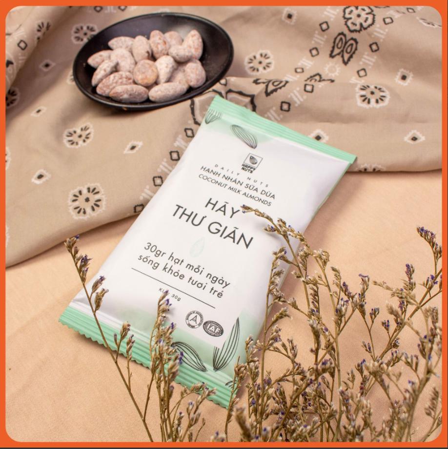 Hạnh nhân sữa dừa được đóng gói trong túi nhỏ 30g rất tiện dụng, có thể đem theo mình để ăn vặt bất kỳ lúc nào mà không phải lo bảo quản như loại hộp lớn. Dòng sản phẩm hạt ăn hàng ngày (daily nuts) của HAPPY NUTS còn có nhiều loại hạt khác để bạn có thể thay đổi khẩu vị. Trên bao bì mỗi loại đều có các thông điệp mà HAPPY NUTS muốn nhắn nhủ đến các bạn. Sống khỏe tươi trẻ nhé khách yêu!