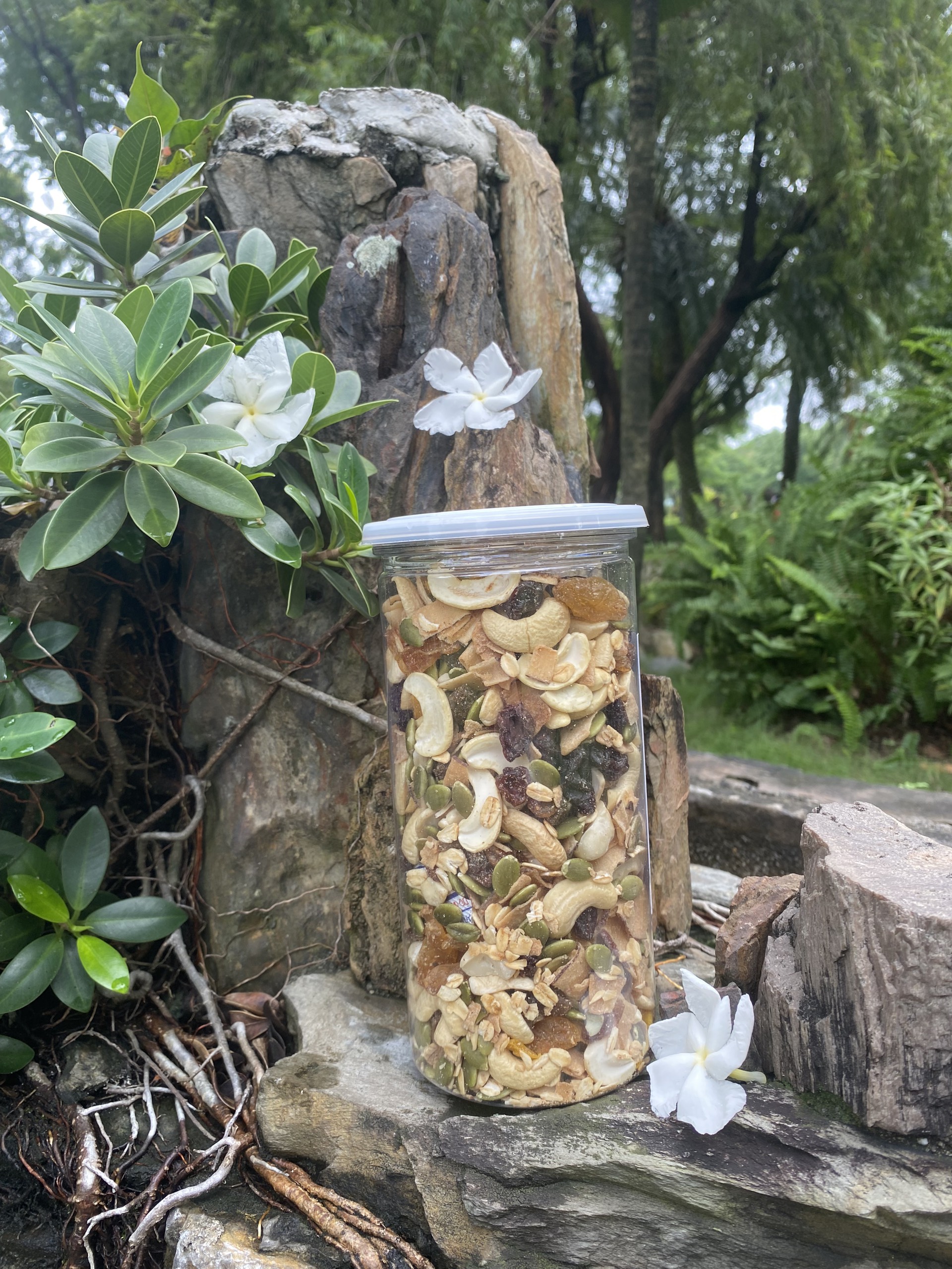 Thành phần: Ngũ cốc dinh dưỡng Granola của Trạm Đường Mật gồm các loại hạt bí xanh, nhân macca, hạt điều, nho khô, dừa khô, xoài sấy, gạo lứt,… và 10% yến mạch.