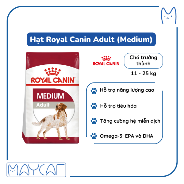 Những giống chó size Medium được biết đến có nguồn năng lượng dồi dào vì đa số giống chó này được sử dụng hỗ trợ trong các công việc của con người từ rất lâu. Cho dù giống chó size Medium này được nuôi trong nhà hay dành thời gian hoạt động ngoài trời, với ROYAL CANIN Medium Adult sẽ giúp giống chó này duy trì khả năng phòng thủ tự nhiên trong suốt vòng đời của chúng, đồng thời cung cấp năng lượng cân bằng cho giống chó này giúp duy trì trọng lượng khỏe mạnh.