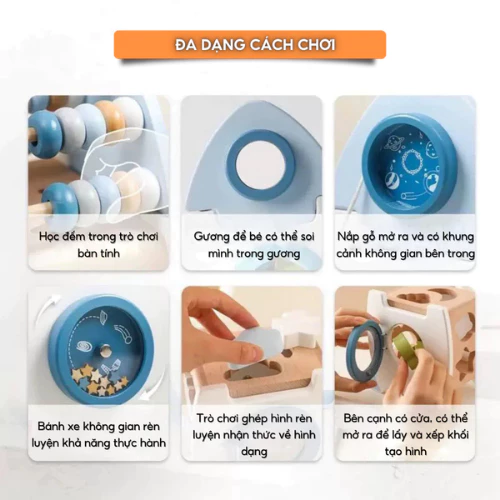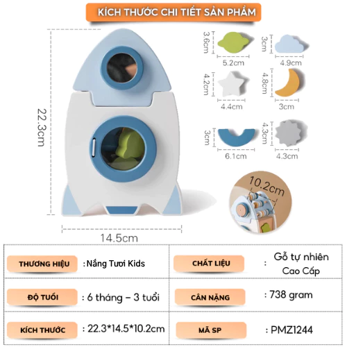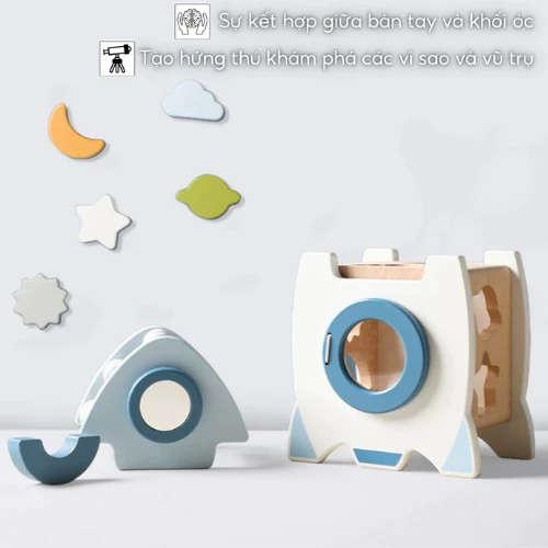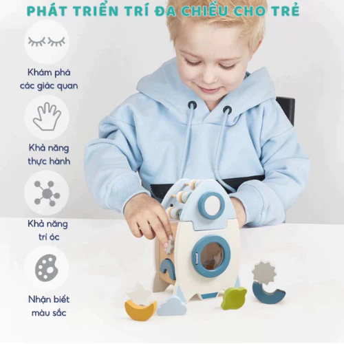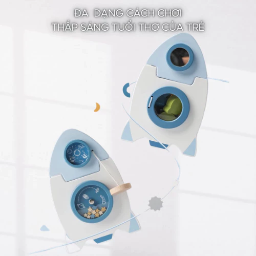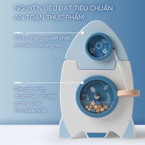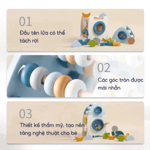 - 6 hoạt động đa dạng: Xoay bánh răng, kéo dây, phân loại hình dạng, mở khóa, đẩy nút, đếm số, giúp bé rèn vận động tinh và nhận biết màu sắc, hình học. - Triết lý Montessori: Khuyến khích tính tự lập, tập trung và khám phá tự nhiên thông qua chơi mà học. - An toàn tuyệt đối: Gỗ tự nhiên 100%, không góc cạnh, thân thiện với môi trường. - Thiết kế tên lửa độc đáo: Màu sắc tươi sáng, hình tên lửa ngộ nghĩnh, thu hút bé yêu thích khám phá vũ trụ.
