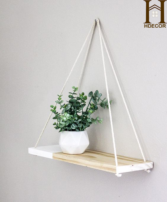 Kệ gỗ treo tường bằng dây thừng vừa là một món đồ decor xinh xắn, để cây cảnh và giúp bạn sắp xếp đồ đạc gọn gàng, tiết kiệm diện tích hơn.