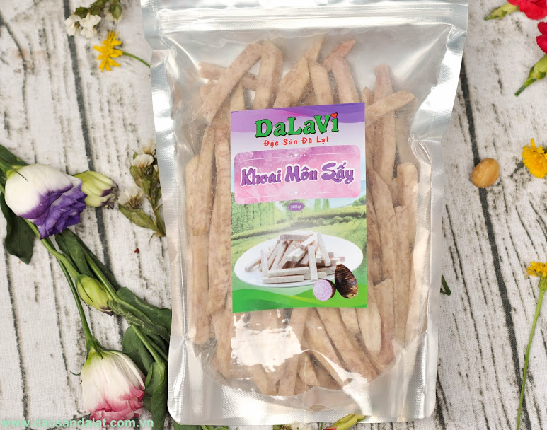 Khoai môn sấy, cắt que vừa ăn, được sấy tự nhiên, giữ hương vị đặt trưng của khoai môn.