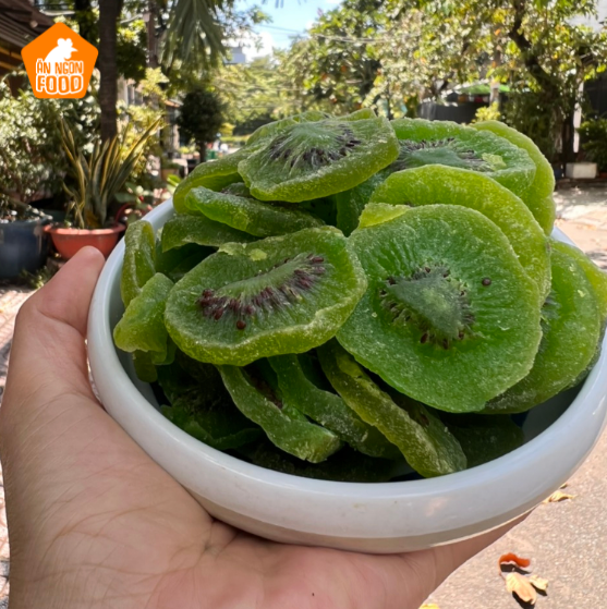 - Từng miếng kiwi sấy khô được cắt thành những lát mỏng vừa phải, khoanh tròn bằng nắm tay của trẻ, có màu xanh của gạo nếp mẹ em hay mua ngoài chợ, nhìn rất hấp dẫn.