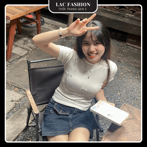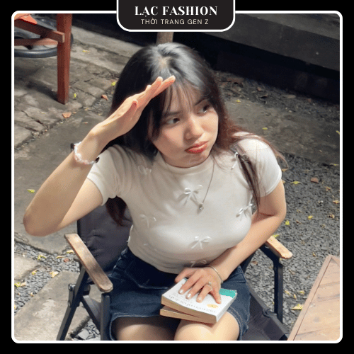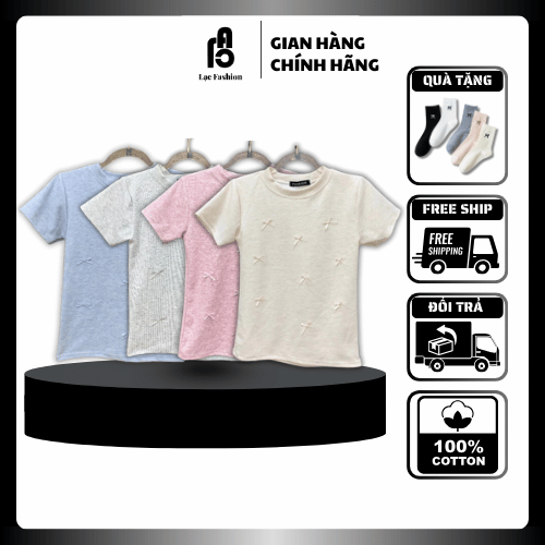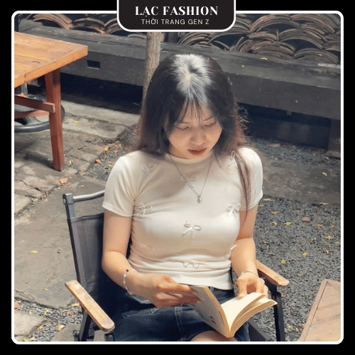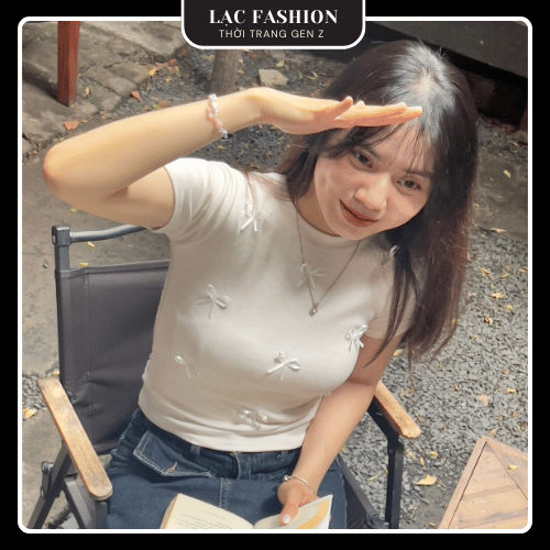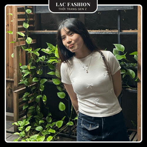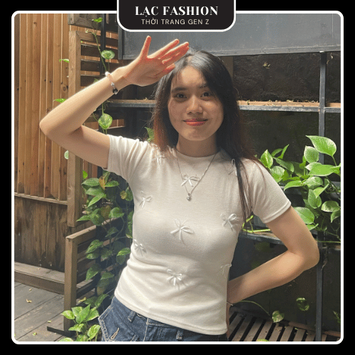 [Lạc Fashion] Áo Thun Ôm Body Cổ Tròn Đính Nơ
