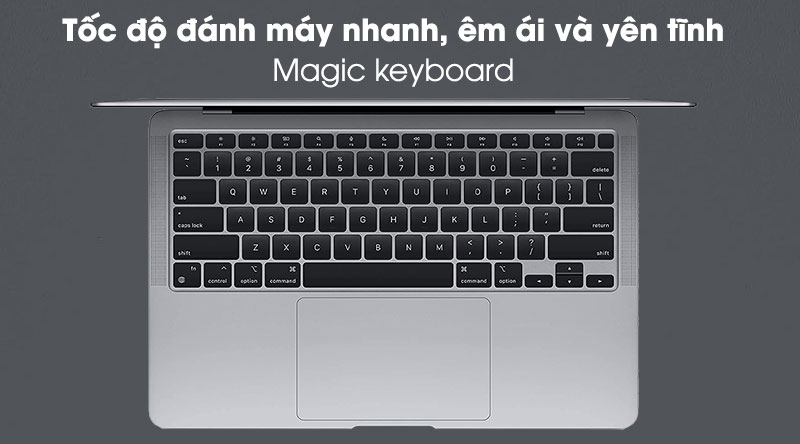 MacBook Air M1 2020 được trang bị bàn phím Magic Keyboard trên cơ chế cắt chéo với bước phím chỉ 1mm. Máy có phím Esc vật lý đồng thời cụm phím mũi tên được bố trí theo kiểu chữ "T" đảo ngược. Với thiết kế này mang lại cho người dùng trải nghiệm đánh máy chính xác, êm ái và vô cùng thoải mái.