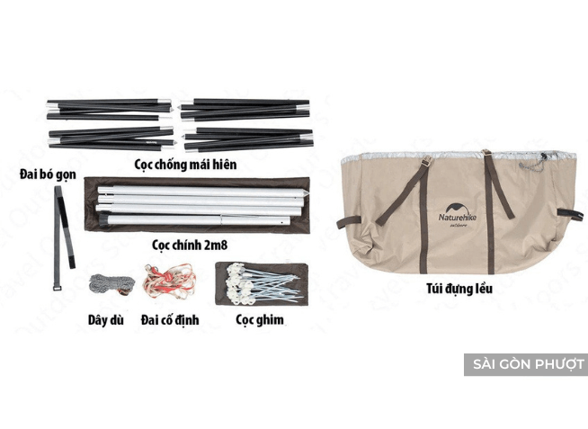 Phụ kiện: 1 Cọc chính 2m8 x Փ33mm; 4 Cọc chống mái hiên 2m x Փ22mm; Túi đựng; 12 Dây dù; 21 Cọc ghim