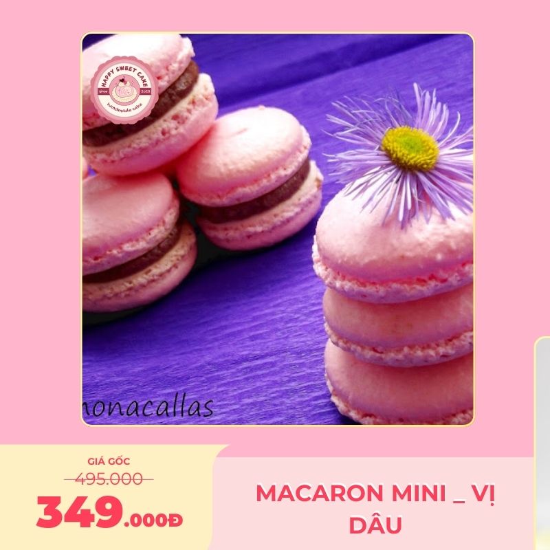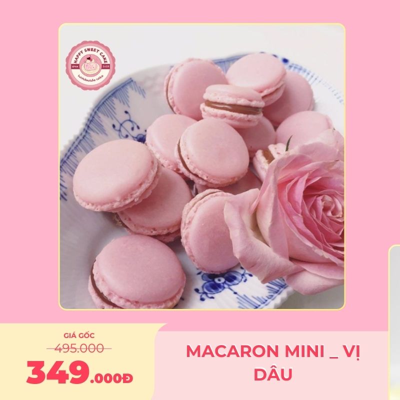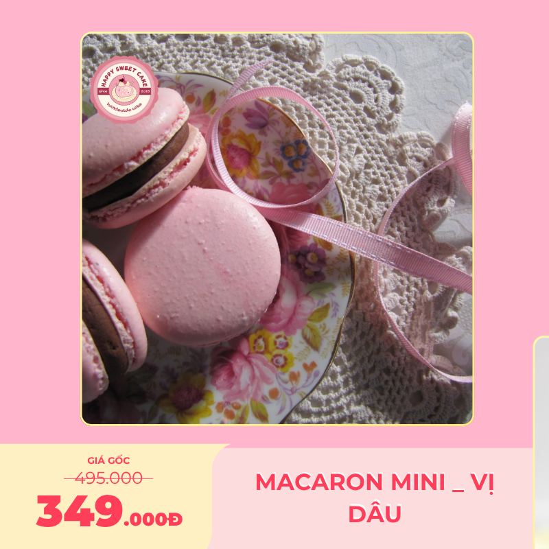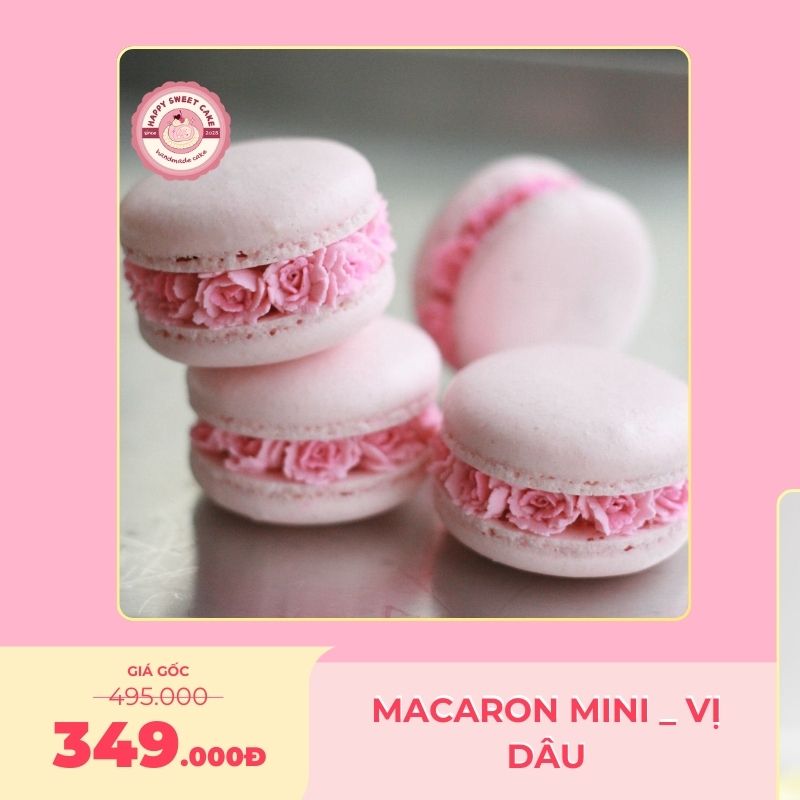 Thưởng thức từng chiếc macaron mini vị dâu mềm mịn, tan ngay trong miệng với lớp vỏ giòn nhẹ, nhân kem dâu ngọt dịu, thơm lừng hương trái cây tươi mát.