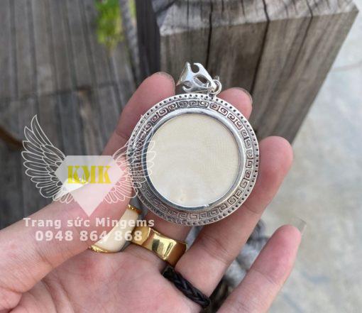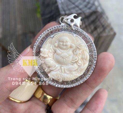 Mặt Di Lạc Ngọc Cưỡi Cá Chép bọc tùy quý khách chọn khảm thêm kim cương hoặc đá SZ xung quanh rất đẹp và phong thủy cao.