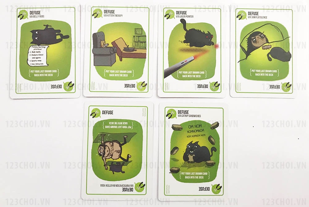 [Hộp Xanh Lá] Bài Mèo Nổ Bản Zombie Việt Hóa Exploding Zombie Kittens Board Game Chất Giấy Dày Chống Nước Bài mèo nổ bản "Zombie Kittens" có thêm luật chơi mới, như người bị nổ bom sẽ chưa chết mà trở thành Zombie và có thêm 1 mạng nữa. Chưa hết bản này còn có những luật chơi khác và lá bài hết sức mới mẻ, chắc chắn sẽ mang đến cho bạn những trải nghiệm vui hơn và thú vị hơn. MÔ TẢ SẢN PHẨM - Thiết kế độc đáo, màu sắc tươi đẹp. - Chất liệu thẻ cứng, bạn sẽ không còn lo bị gió thổi bay. - Tổng cộng 61 lá. - Sản xuất tại: Việt Nam. - Chất liệu: Couche cán màng cứng cáp. - Kích thước lá: 5,7 - 8,7cm. CÁCH CHƠI - Bạn sẽ có một bộ bài có chứa một số lá Exploding Kittens. Cách chơi là bạn sử dụng những lá bài đặt xuống mặt bàn và thay phiên rút những lá bài trên chồng bài rút cho đến khi một người nào đó rút phải lá Exploding Kitten. Khi đó, người rút phải lá bài đó sẽ bị nổ. Họ bị chết ngay và rời khỏi game. Trò chơi tiếp tục cho đến khi chỉ còn lại một người, và người đó là người chiến thắng. SET UP 1. Lấy hết 4 lá Exploding Kittens và 6 lá Defuse ra khỏi chồng bài. 2. Xào xấp bài còn lại và chia cho mỗi người 4 lá bài. 3. Chia cho mỗi người thêm 1 lá Defuse, mỗi người sẽ có tổng là 5 lá bài trên tay,chỉ mình xem không cho người khác biết. (DEFUSE: Là lá duy nhất có thể giúp bạn an toàn khi gặp lá Exploding Kitten. Khi bạn rút phải lá Exploding Kitten, bạn sử dụng ngay lá Defuse, thay vì bị nổ, bạn có thể lấy lại lá Explding Kitten đặt lại trên chồng bài rút theo ý thích của mình). 4. Đặt lại những lá Exploding Kittens ít hơn 1 lá so với số người chơi, bỏ những lá dư ra khỏi game. CÔNG DỤNG SẢN PHẨM - Trò chơi Board Game giúp tăng sự tập trung cao độ và khả năng ghi nhận tình huống. - Trò chơi Board Game giúp tăng khả năng phân tích vấn đề và đánh giá tình huống. - Trò chơi Board Game dạy trẻ học cách giải quyết vấn đề. - Trò chơi Board Game xây dựng kỹ năng toán học cơ bản. - Trò chơi Board Game nâng cao khả năng tư duy logic. - Trò chơi Board Game phát triển khả năng ngôn ngữ và giao tiếp. - Trò chơi Board Game phát triển các kỹ năng xã hội. CAM KẾT - Sản phẩm y chang mô tả. - Số lượng tồn kho được cập nhật chính xác 100%. - Được phép đổi trả nếu có lỗi từ nhà sản xuất trong vòng 3 ngày nhận hàng. - Thời gian chuẩn bị hàng siêu tốc trong vòng 24h.